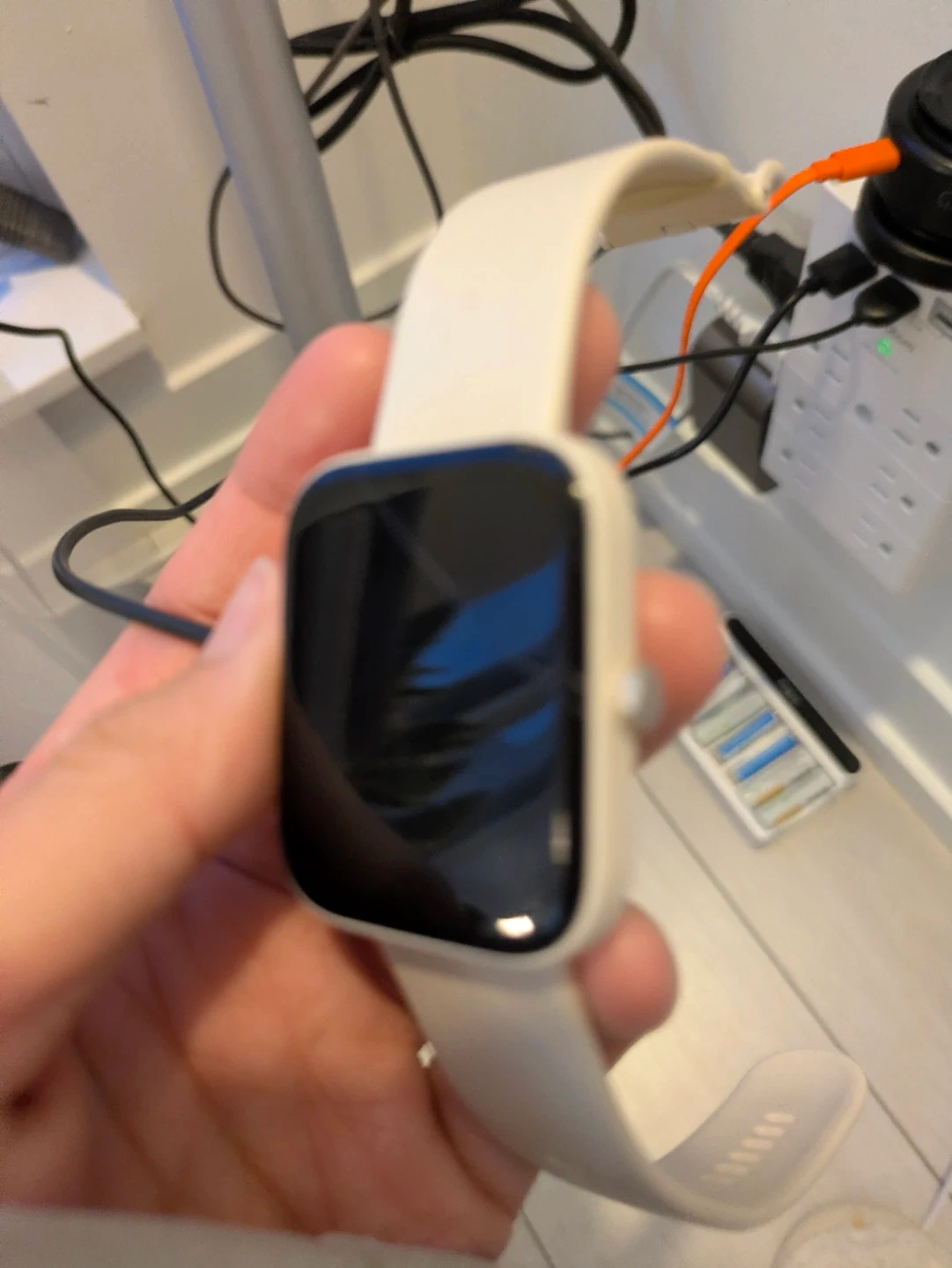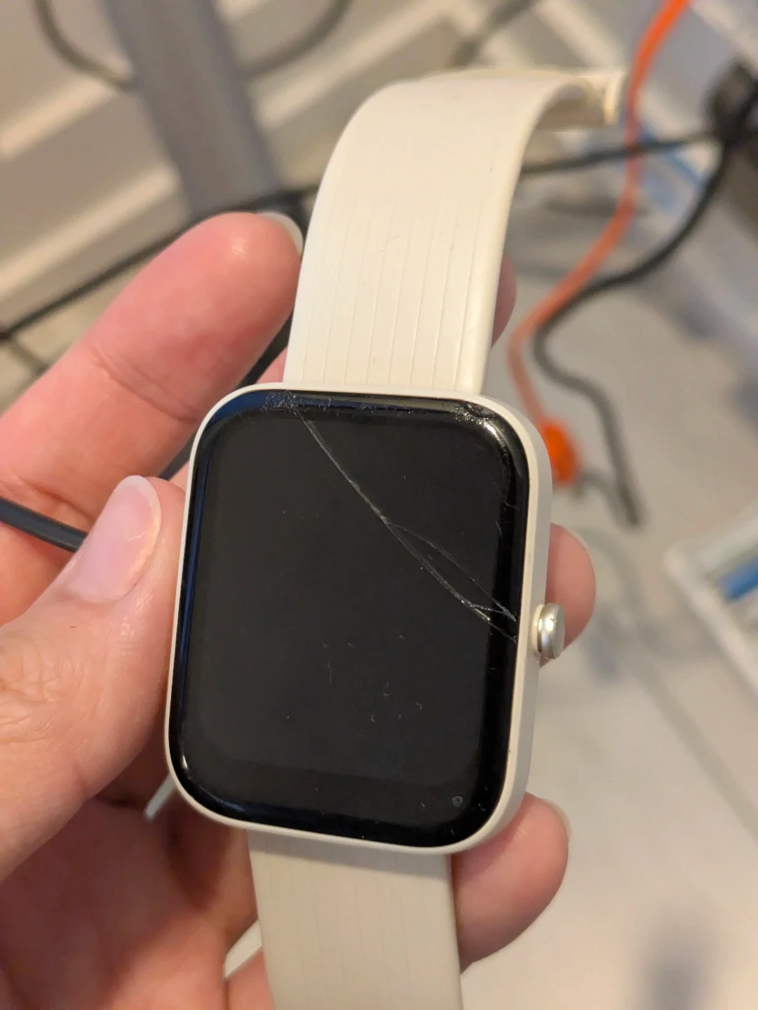 Amazfit Bip 3 Pro in beige. Still functional even though screen is cracked. And missing a strap holder - I've using it with elastic bands.