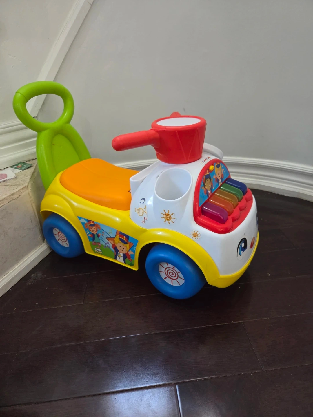 This Fisher-Price Little People ride-on toy is designed to entertain your little one. It features a musical keyboard and a drum with a handle. The bright colours and fun character decals make it engaging for young children. This toy is great for developing gross motor skills as they push or ride along.