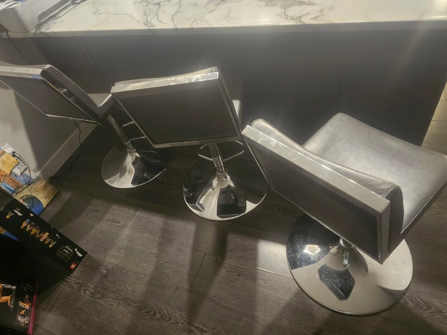 Three contemporary bar stools featuring grey faux leather seats and chrome accents. These stools are height-adjustable and swivel 360 degrees. They're built on a sturdy chrome base with a footrest. Great for a kitchen island or home bar!