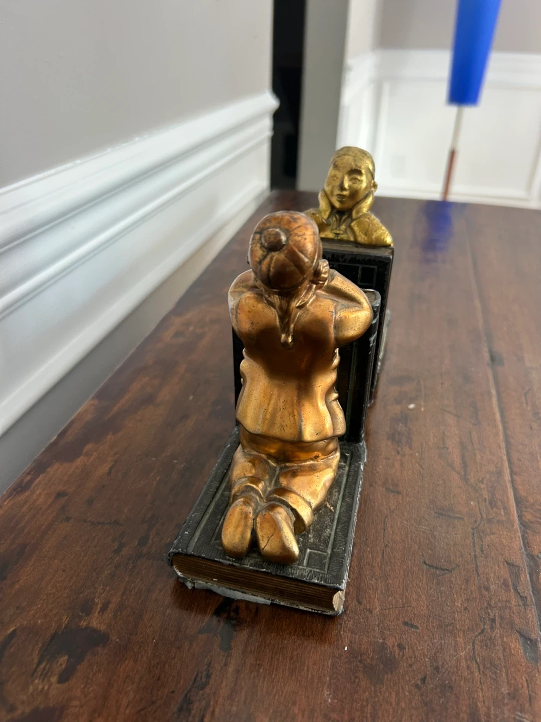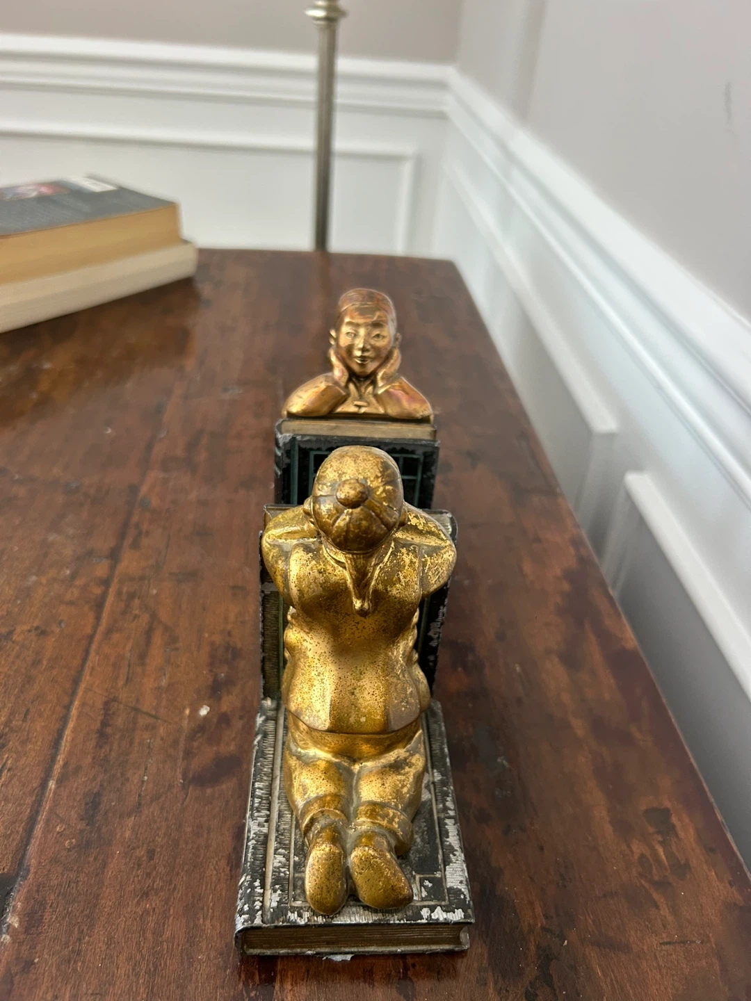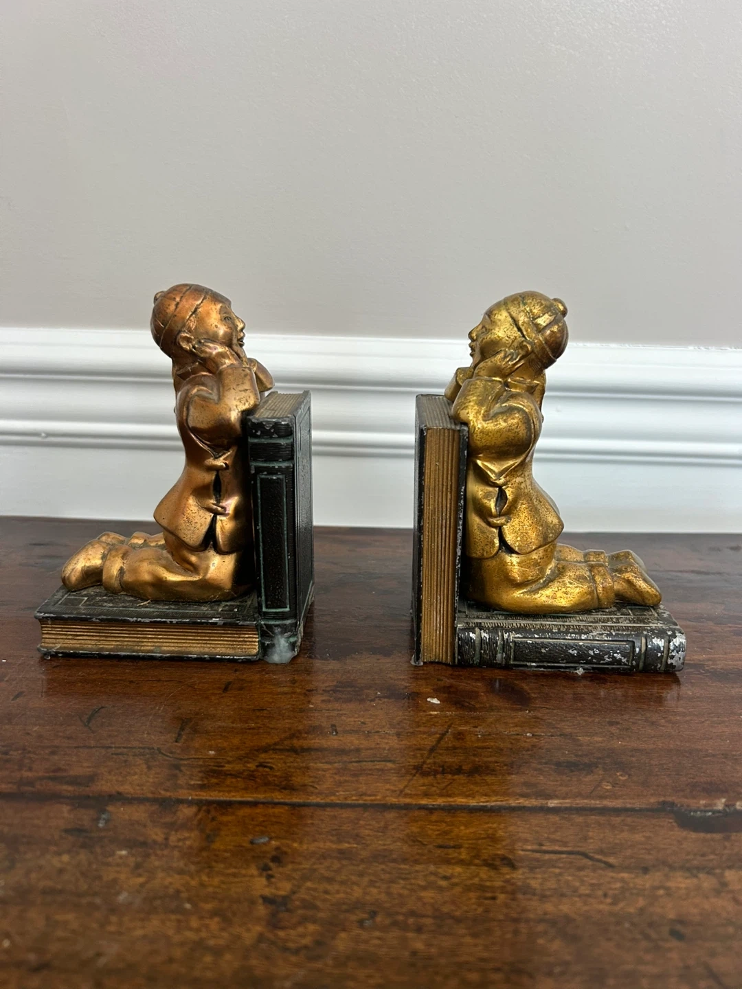 This is a pair of decorative bookends featuring figures kneeling on books. They appear to be made of metal with a brass-like finish. These would make a great addition to any bookshelf!