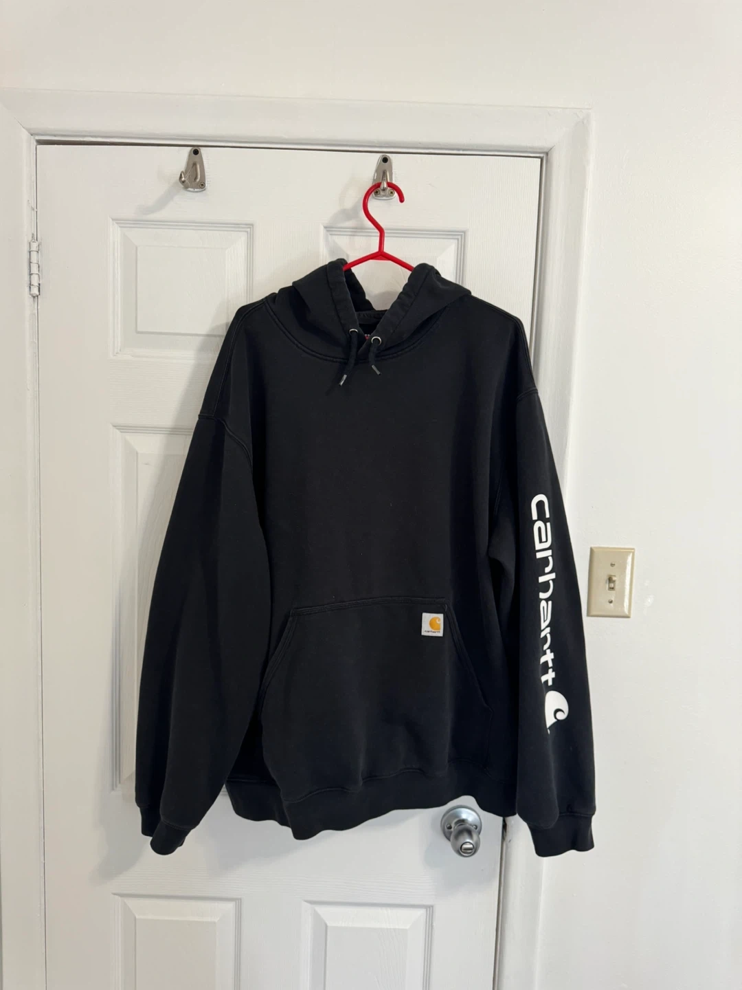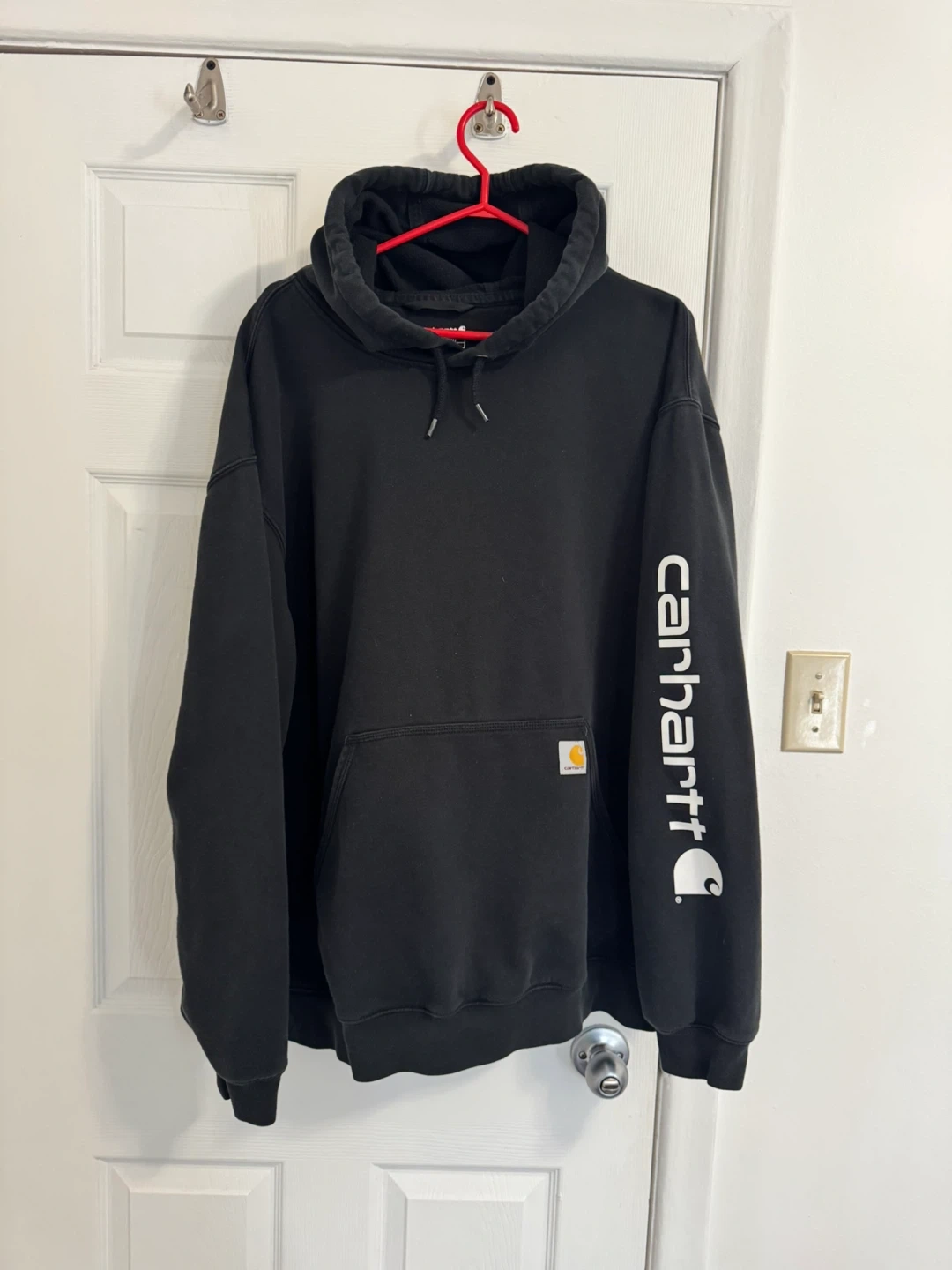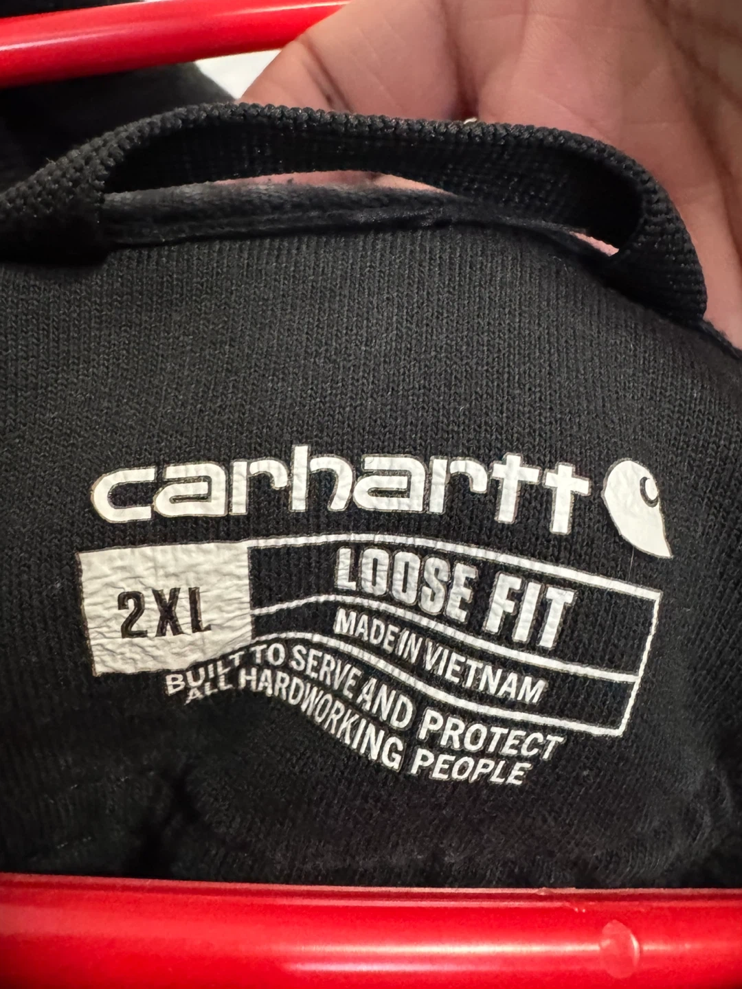 This Carhartt hoodie is in a loose fit and size 2XL. It's black with "Carhartt" printed vertically on the sleeve. It's made in Vietnam. This hoodie is built to serve and protect all hardworking people.