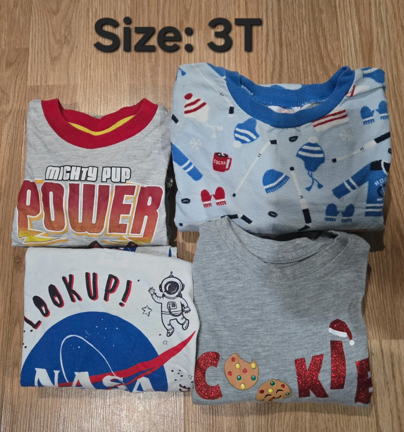 Four pairs of kids' pajamas. Includes designs with Paw Patrol, NASA, and holiday themes. Size 3T.