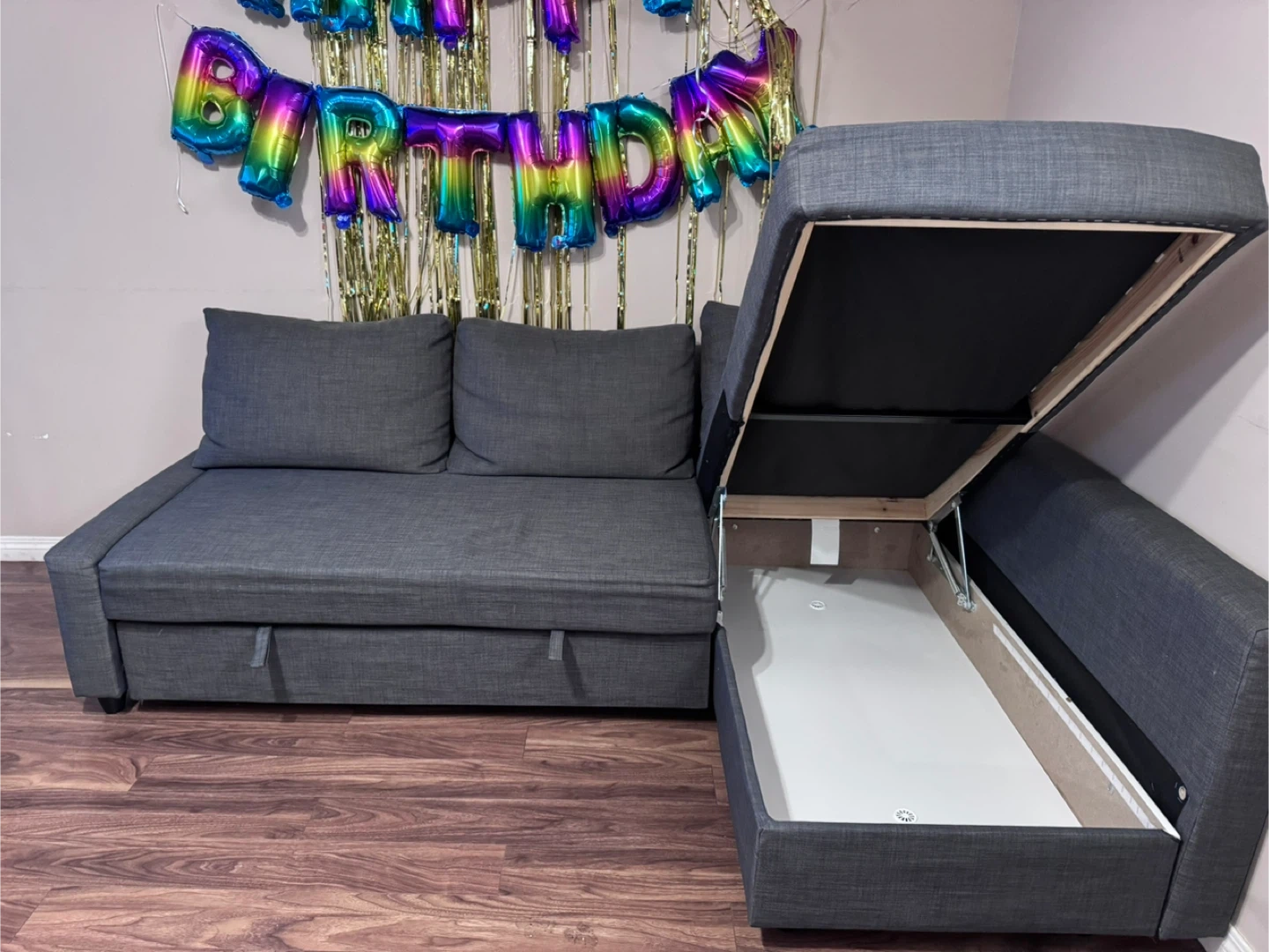 This sectional sofa bed is upholstered in a dark grey fabric. It features a pull-out bed mechanism and a storage chaise. Great for small spaces!