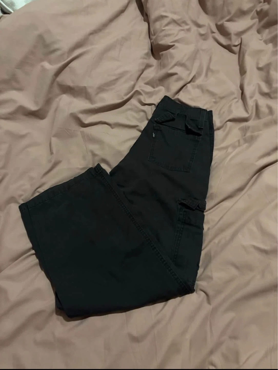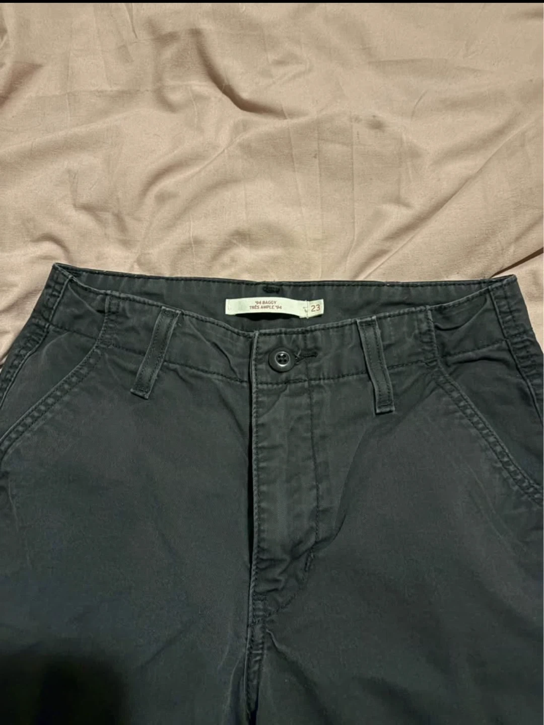 Levi's black cargo pants for women. These pants are size 23 with multiple pockets. They're great for everyday wear and outdoor activities! Have a fair amount of stretch to them.