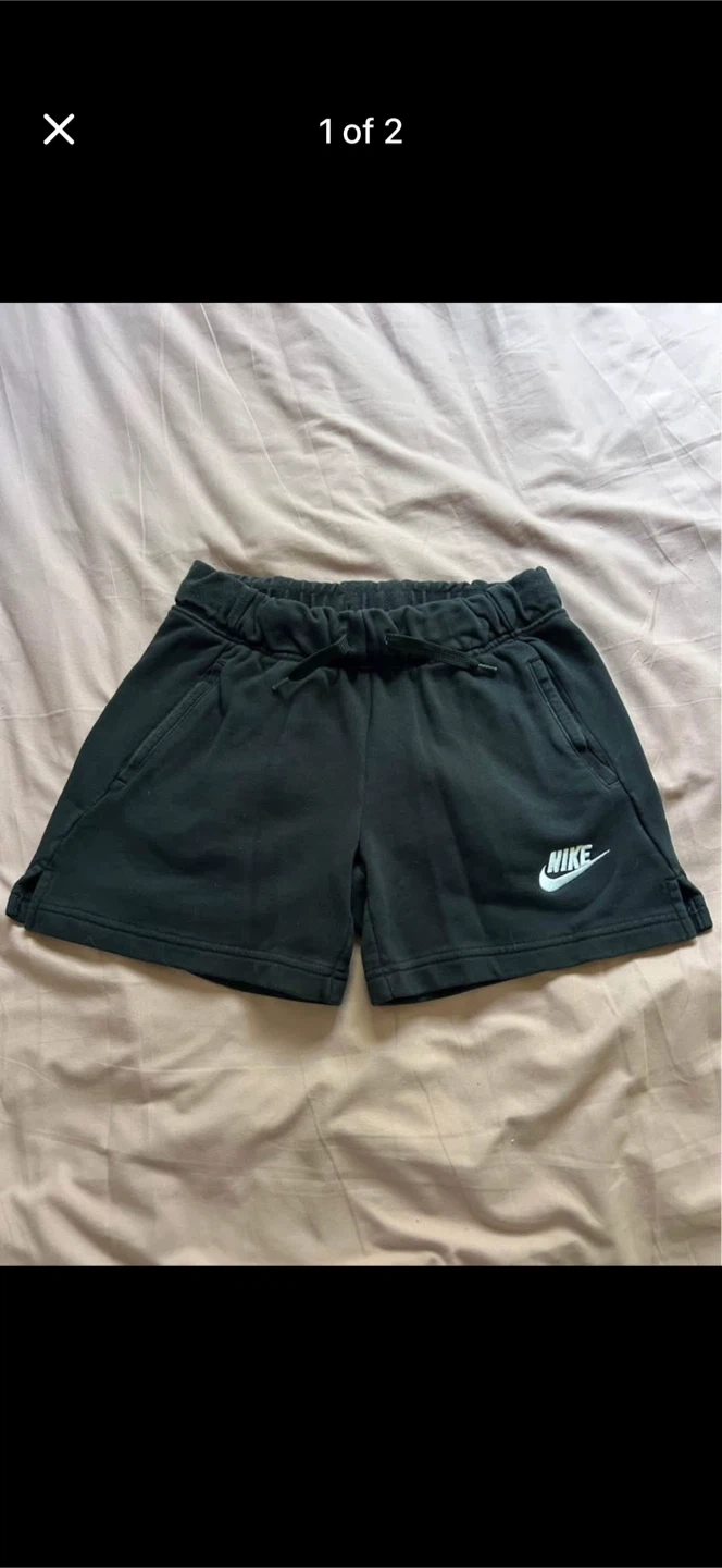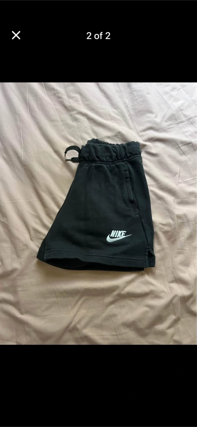 These are black sweat shorts from Nike. They have an elastic waistband with a drawstring. Includes two side pockets. Size kids large. I am a women’s xs and small and they fit me perfectly.