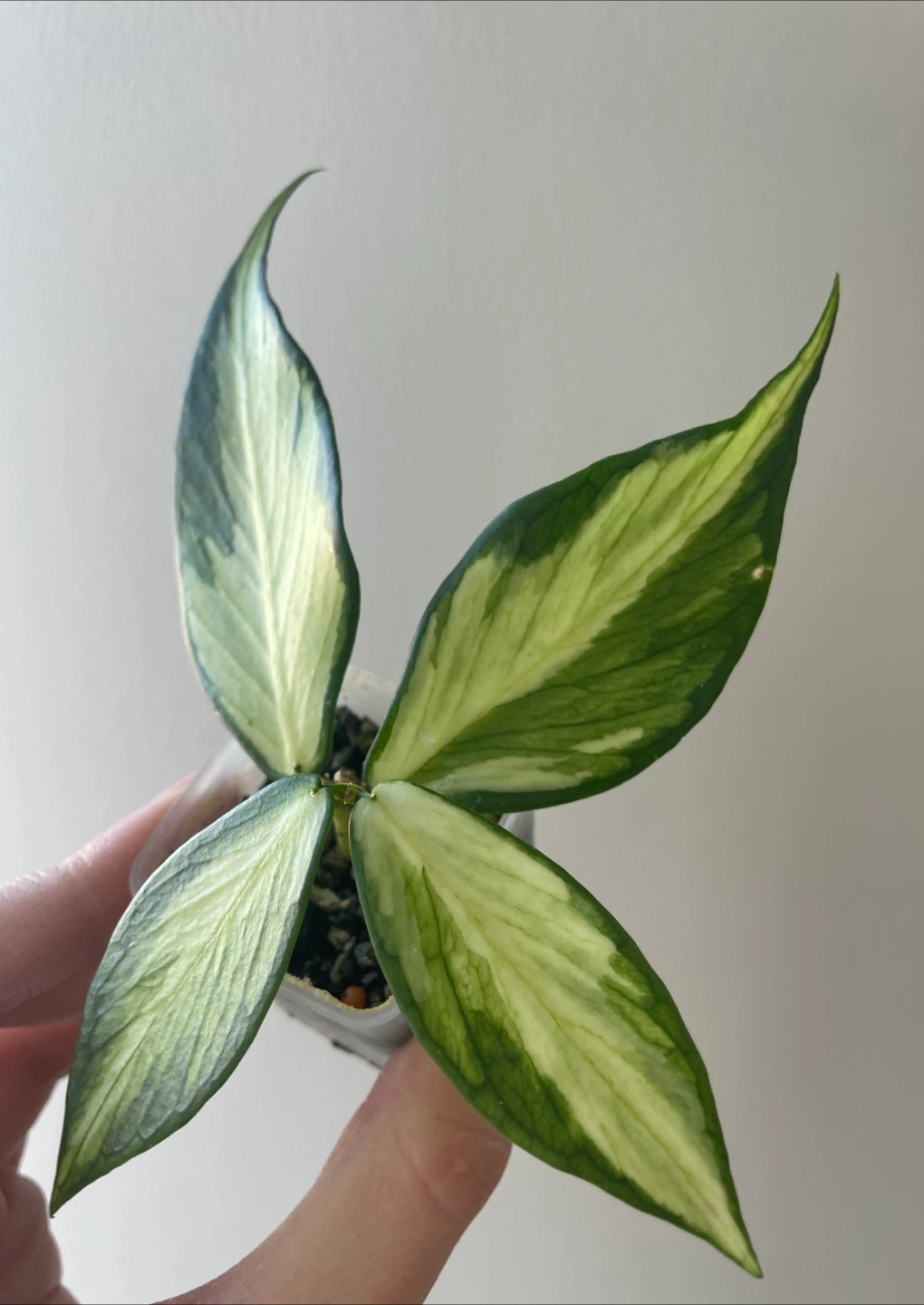 This is a small inner variegated Hoya polyneura plant in a clear plastic pot with soil/pon. It has lovely green and cream variegation on its leaves. The plant is healthy and ready for a new home. It’s easy to take off and grows pretty fast