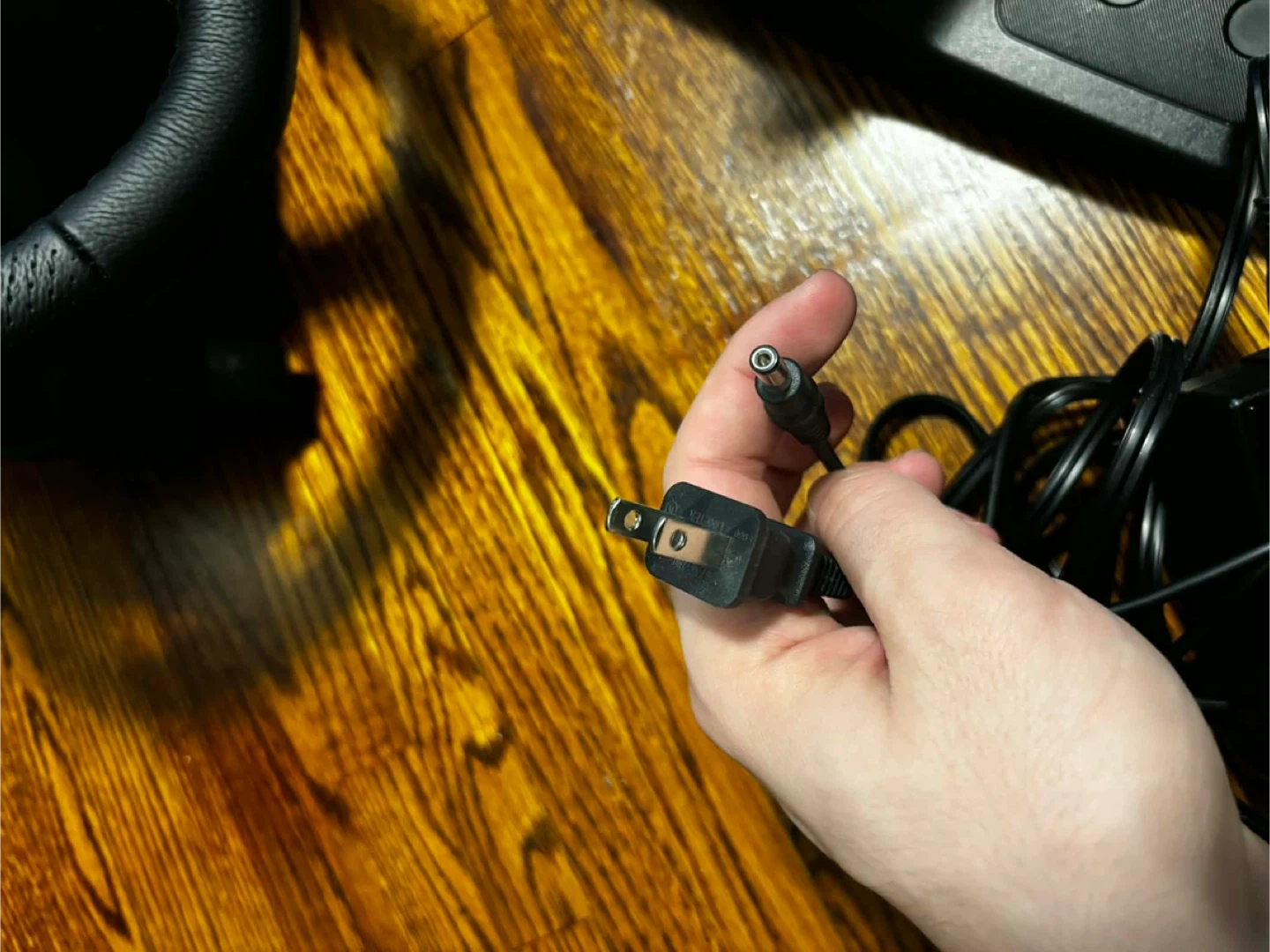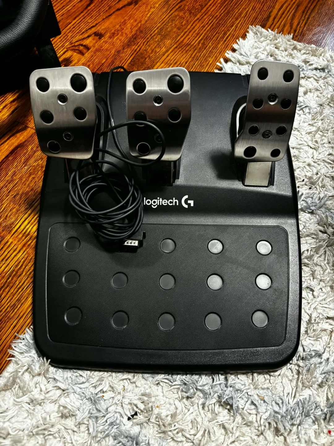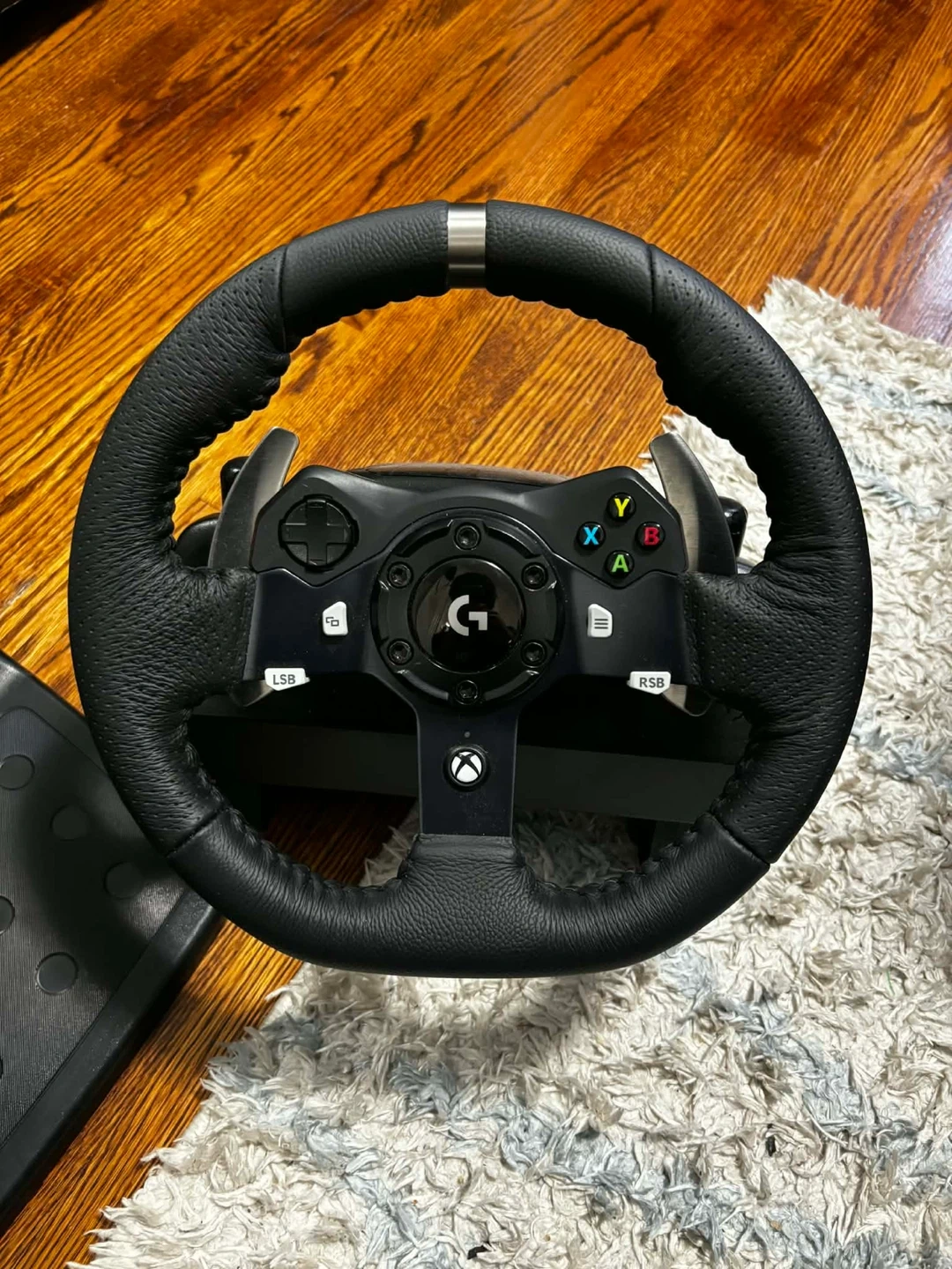 Logitech G920 racing wheel and pedals set. Features a leather-wrapped steering wheel and realistic pedals for an immersive driving experience. Includes power adapter and USB cable.