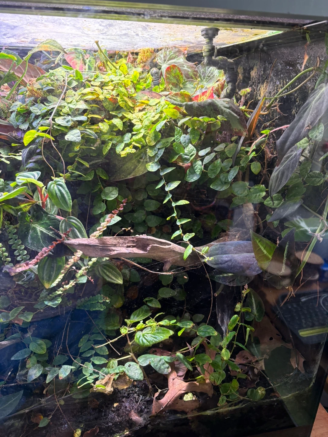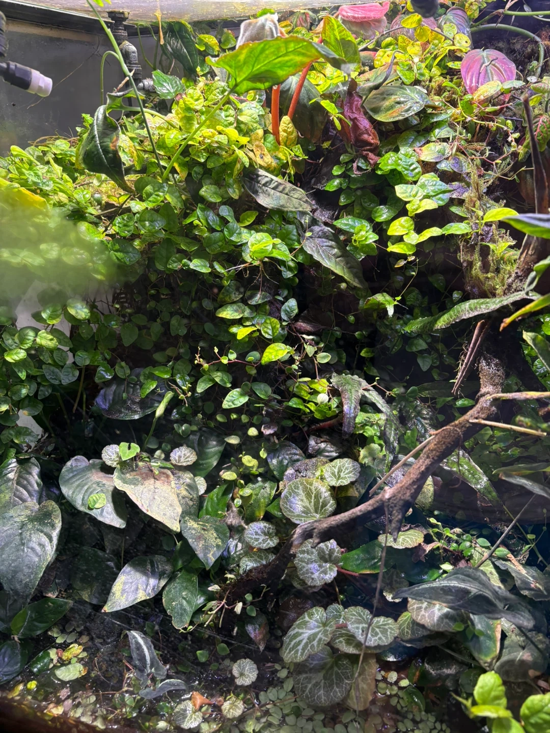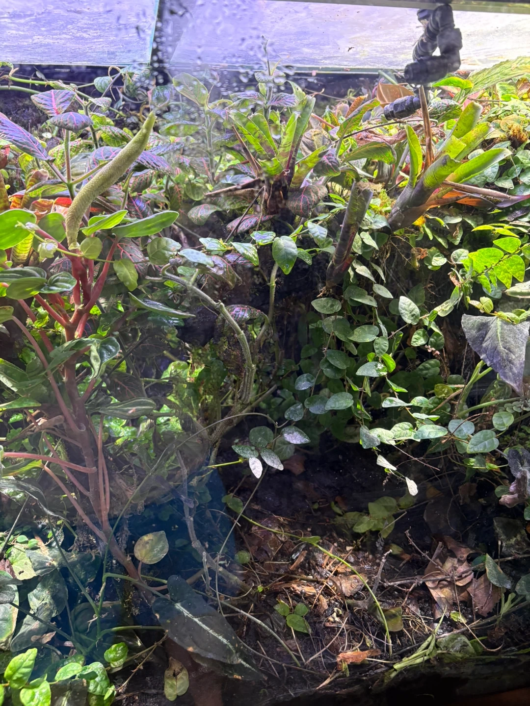 Various bromeliads, orchids, anubias and others bought from shows. The tank almost runs itself.