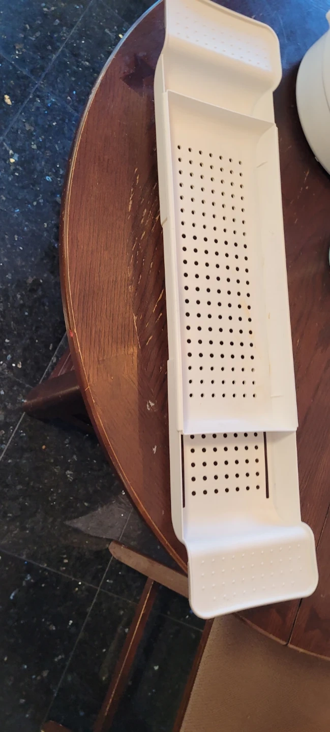 This is a white plastic bath caddy that extends. It has a perforated surface for drainage. Perfect for keeping your bath essentials organized and within reach. It can accommodate various tub sizes!