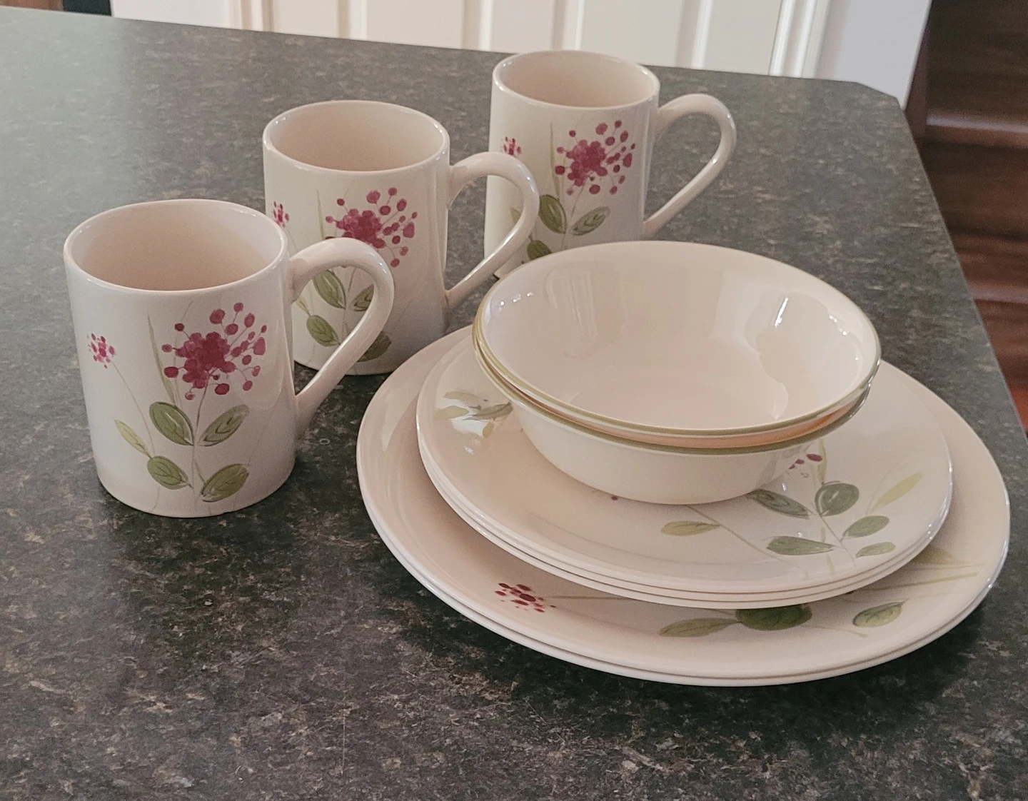 This is a set of three ceramic mugs and four plates, along with one bowl. All pieces have a floral and leaf pattern. The mugs feature a pink floral design with green leaves. The plates and bowl are cream-coloured with a delicate green and pink leaf motif and a subtle rim detail. Microwave and dishwasher safe.