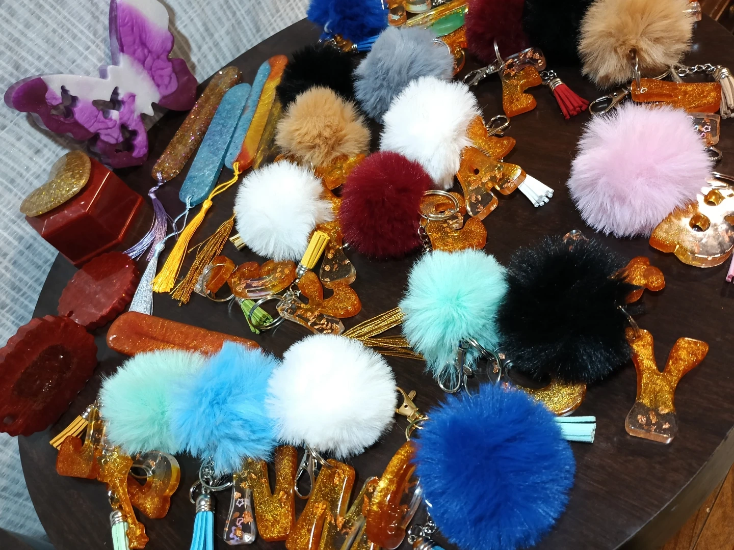 A collection of fluffy pom pom and sparkly glitter keychain charms. Includes various colours and designs, great for personalizing bags or keys. They're fun accessories for anyone!