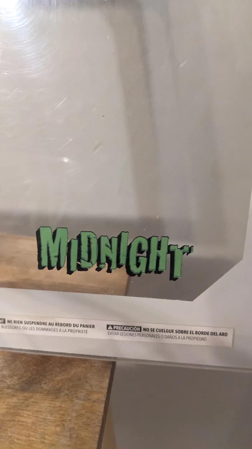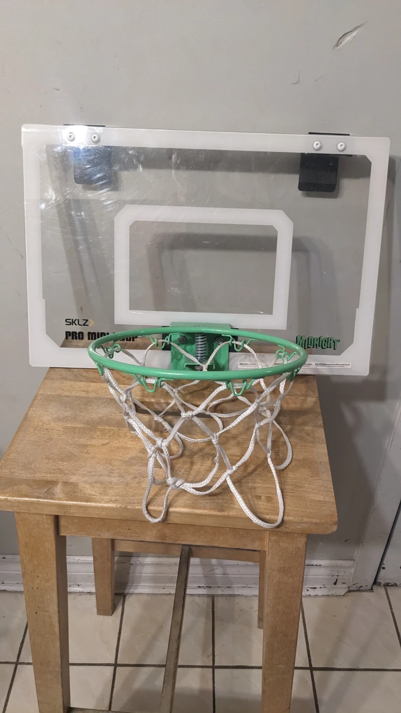 This is a SKLZ Pro Mini Hoop basketball set. It's a clear backboard with a green breakaway rim and net. It's sized for mini basketballs.