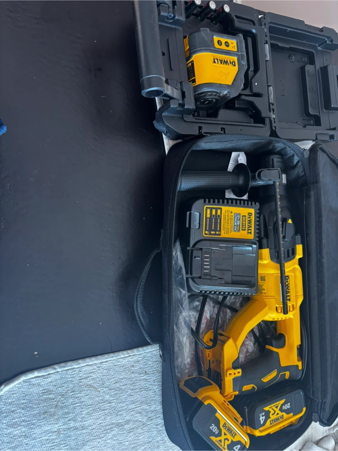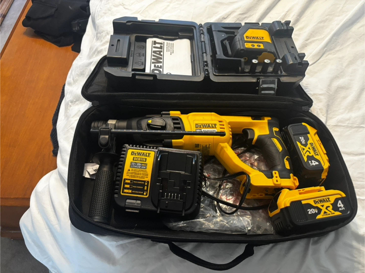 This is a DEWALT 20V MAX cordless rotary hammer kit. It includes the rotary hammer, two 20V 4Ah lithium-ion batteries, and a charger. The kit comes in a soft bag with a hard case insert for the hammer and accessories. It's ready for your next job!