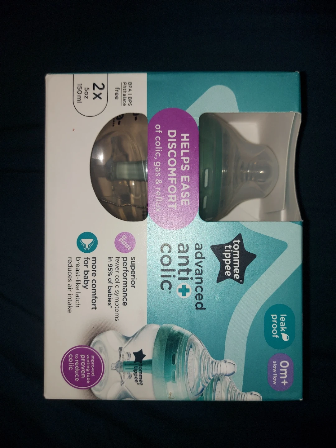 Tommee Tippee's advanced anti-colic bottles help ease discomfort from colic, gas, and reflux. Superior performance tackles colic symptoms in 95% of babies. Bottles are BPA, BPS, and phthalate free. Comes with a slow-flow, 0m+ nipple. Brand new in box