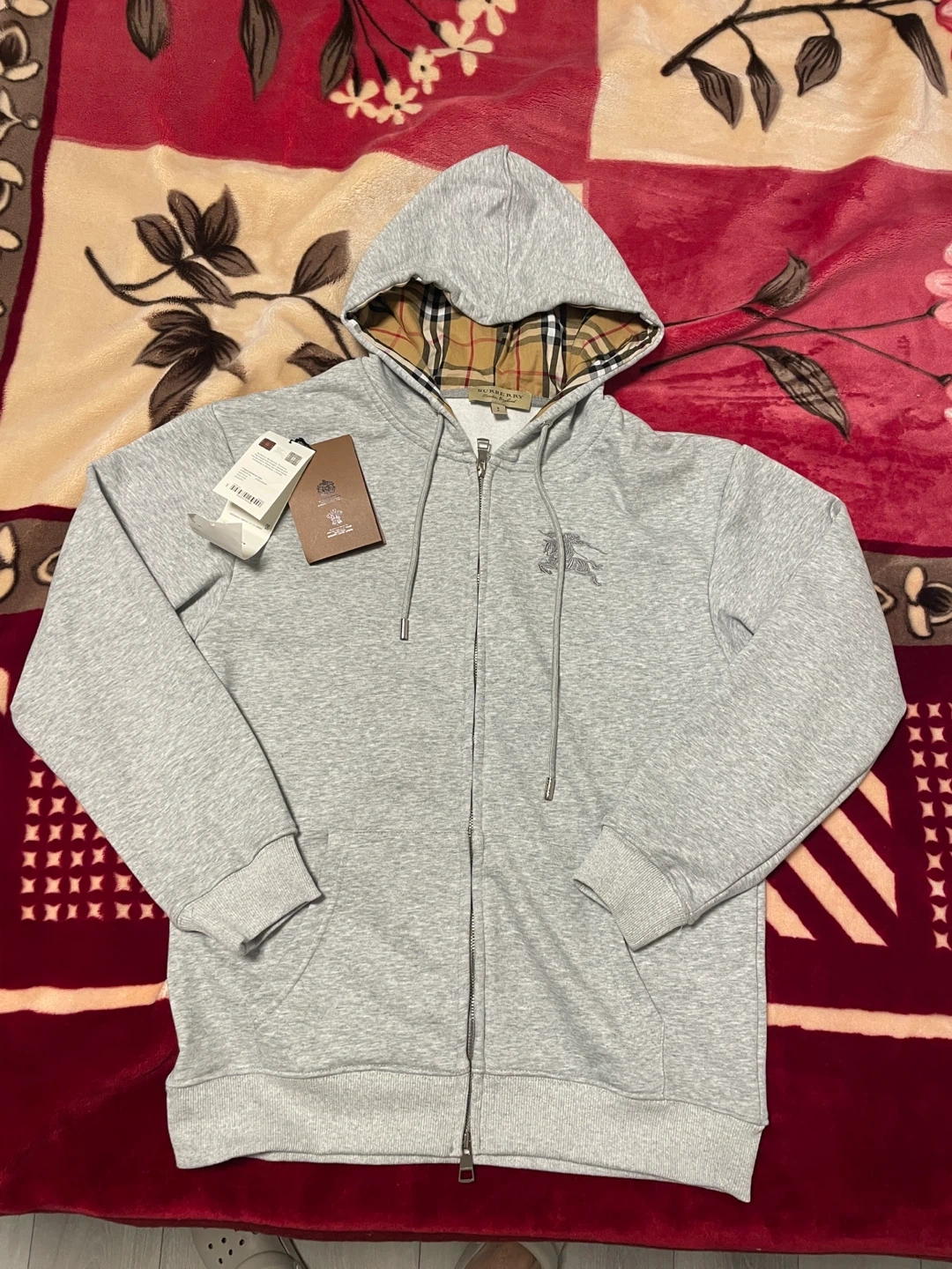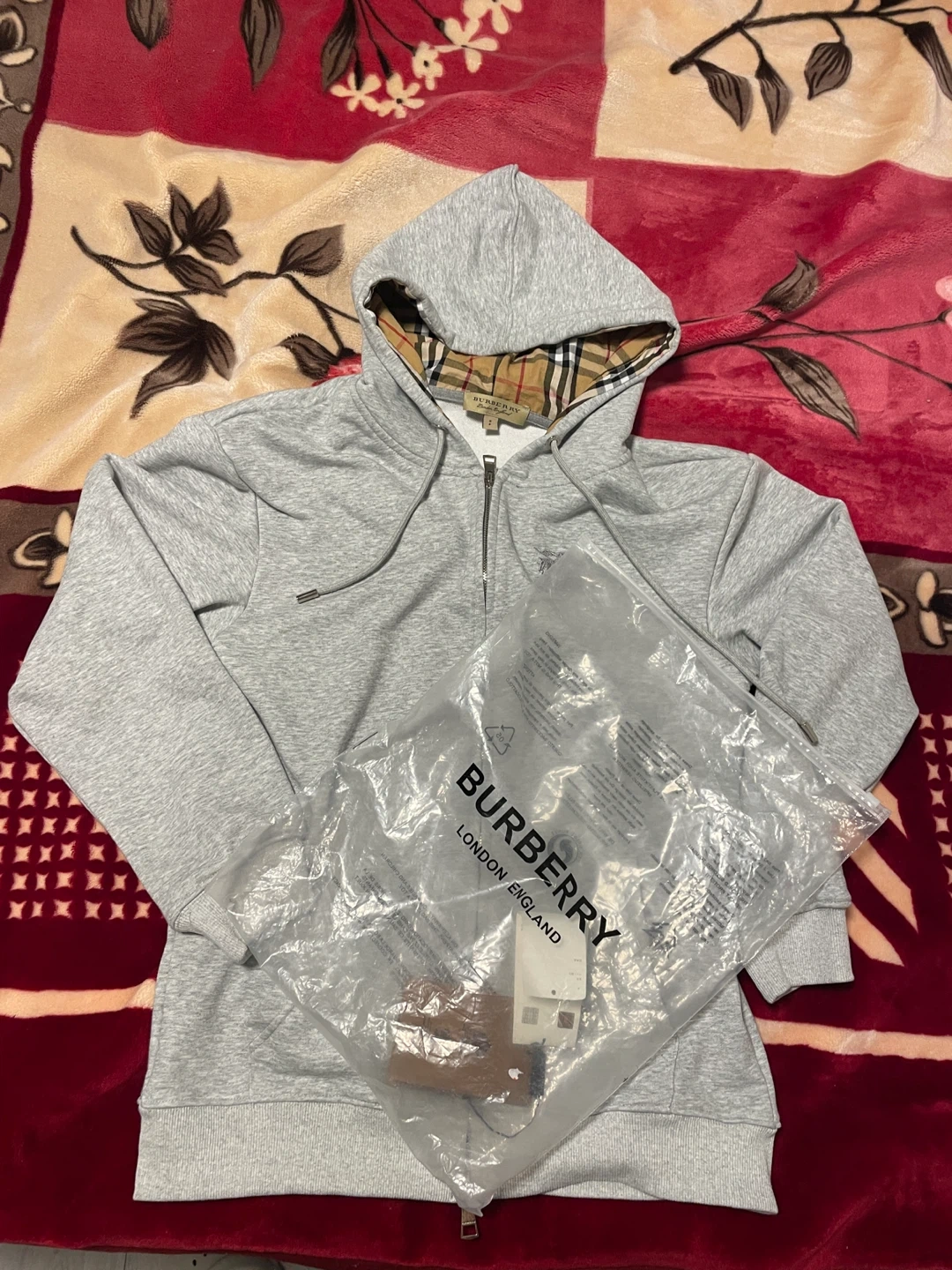 Grey zip-up hoodie from Burberry. It's made of 100% cotton with the signature check lining in the hood. Includes original tags and packaging.