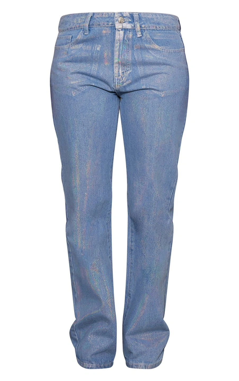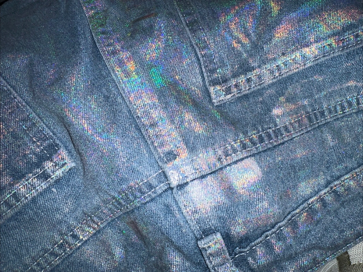 These petite flare jeans are in a blue wash with a metallic sheen. Made from denim. Includes original tags.