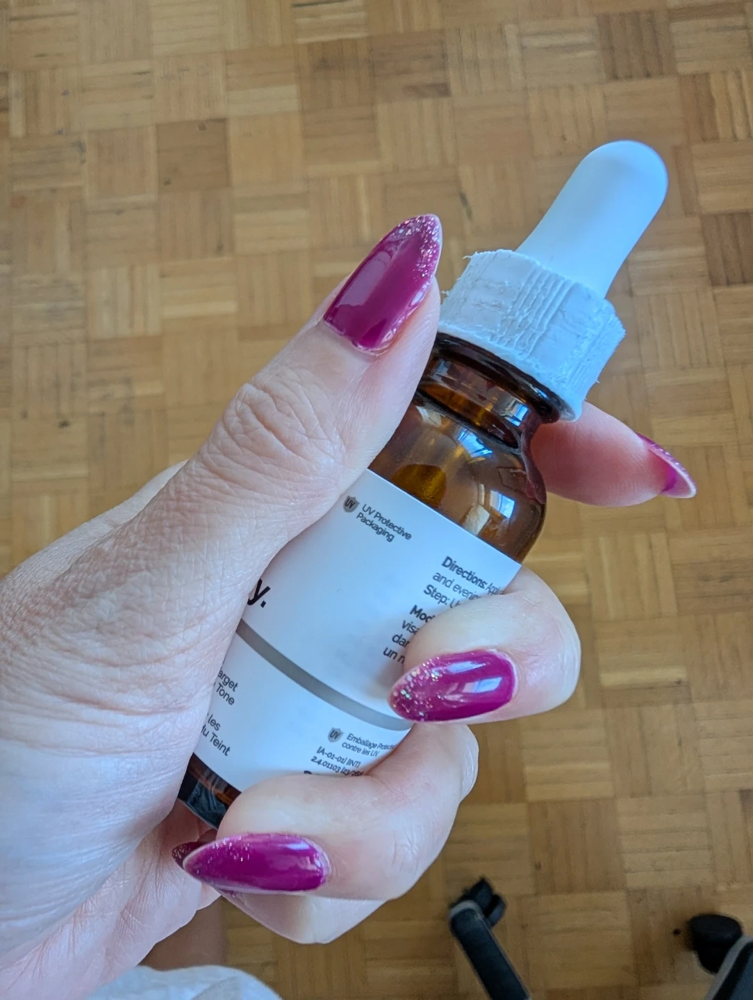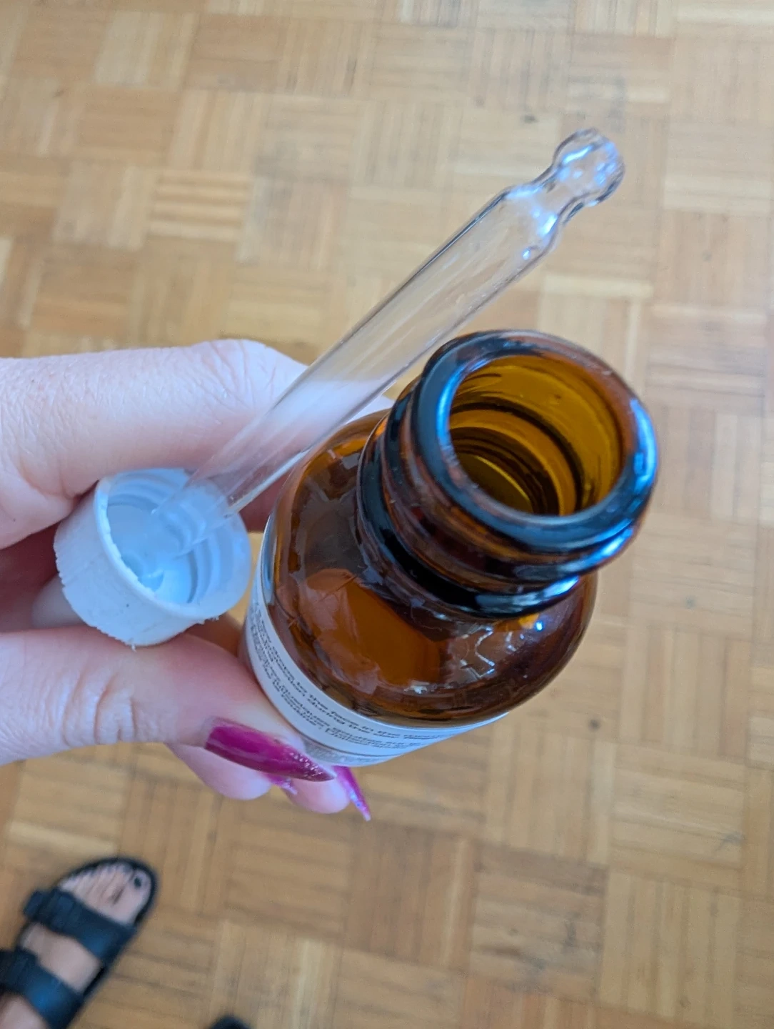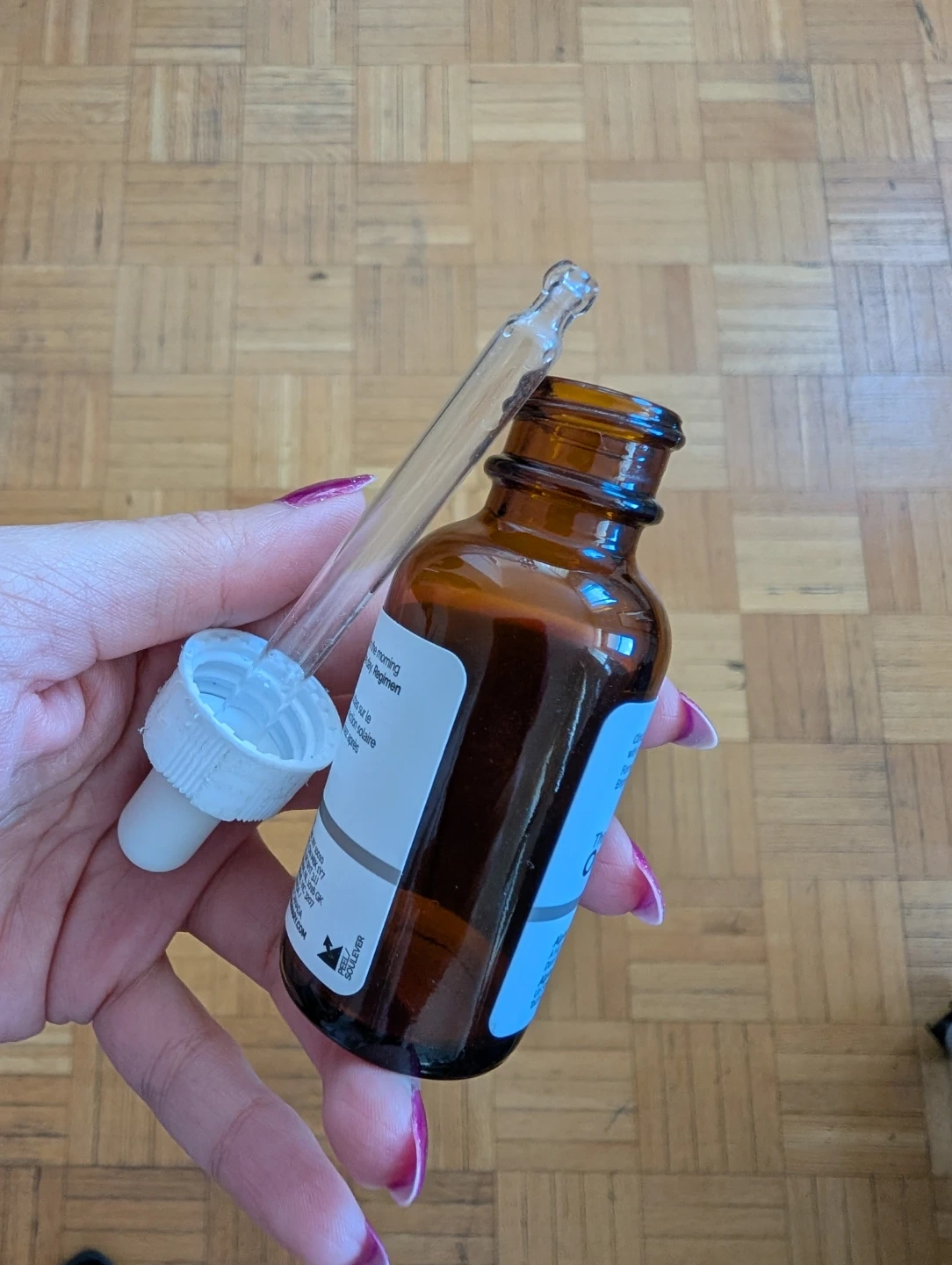 This is an empty amber 30 mll glass bottle with dropper from The Ordinary Niacinamide 10% + Zinc 1% serum.