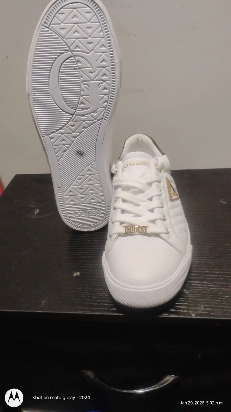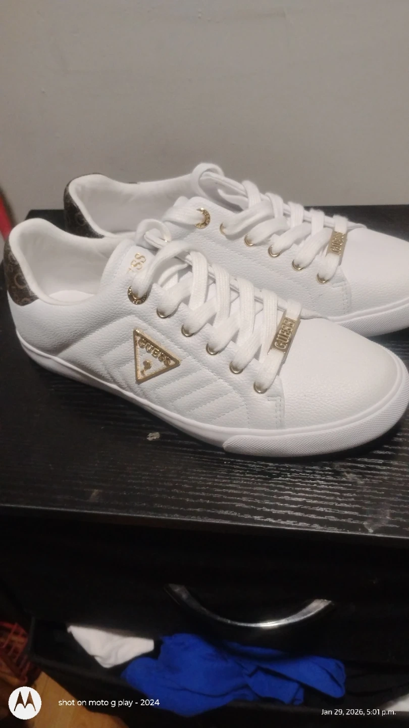 These Guess sneakers are a crisp white colour with gold accents. They feature a textured exterior and the signature Guess triangle logo on the side. The sole is white and the interior has a brown and gold patterned lining. Size is 9 women
