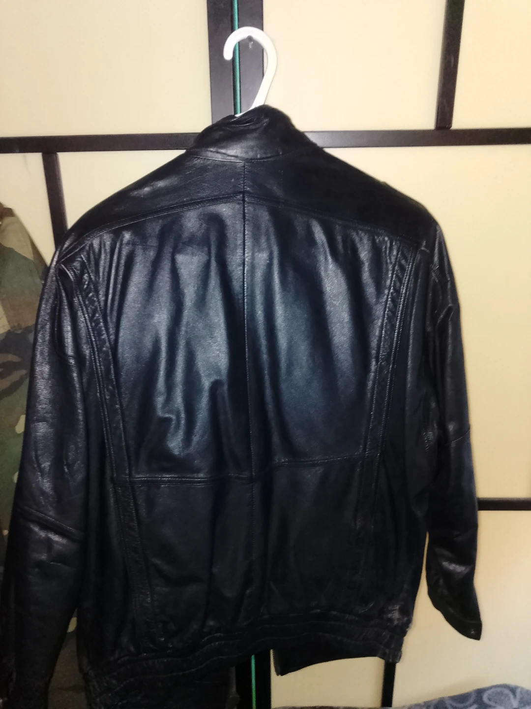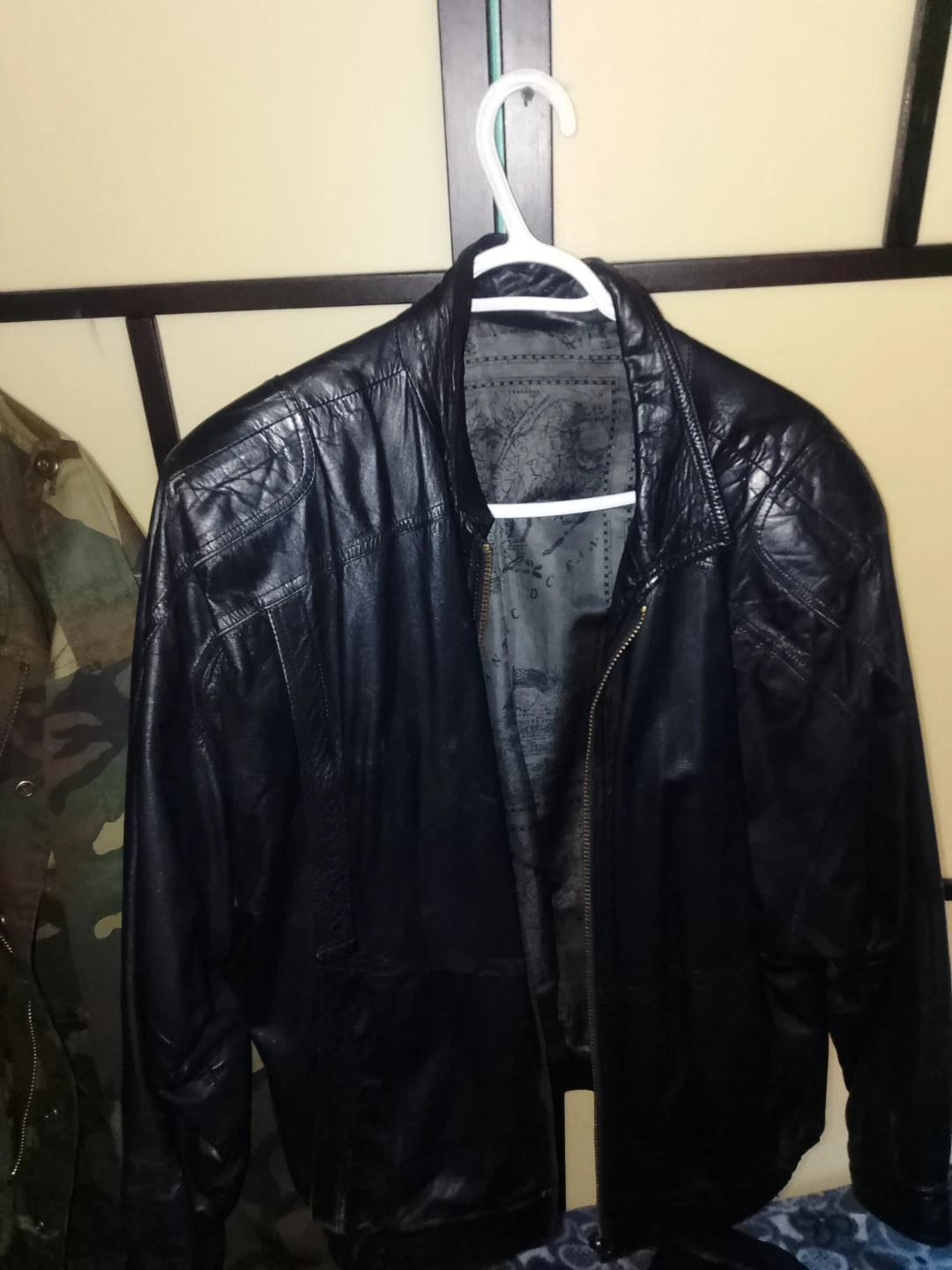 Classic black leather bomber jacket. Features a quilted shoulder design and a zippered front closure. Fully lined interior.