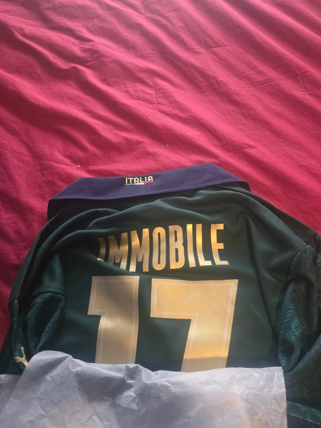 This is a green Puma soccer jersey for Italy, featuring Immobile's name and number 17 on the back. It's a short-sleeved shirt with a collared neck. This jersey is great for any soccer fan who supports the Italian national team!