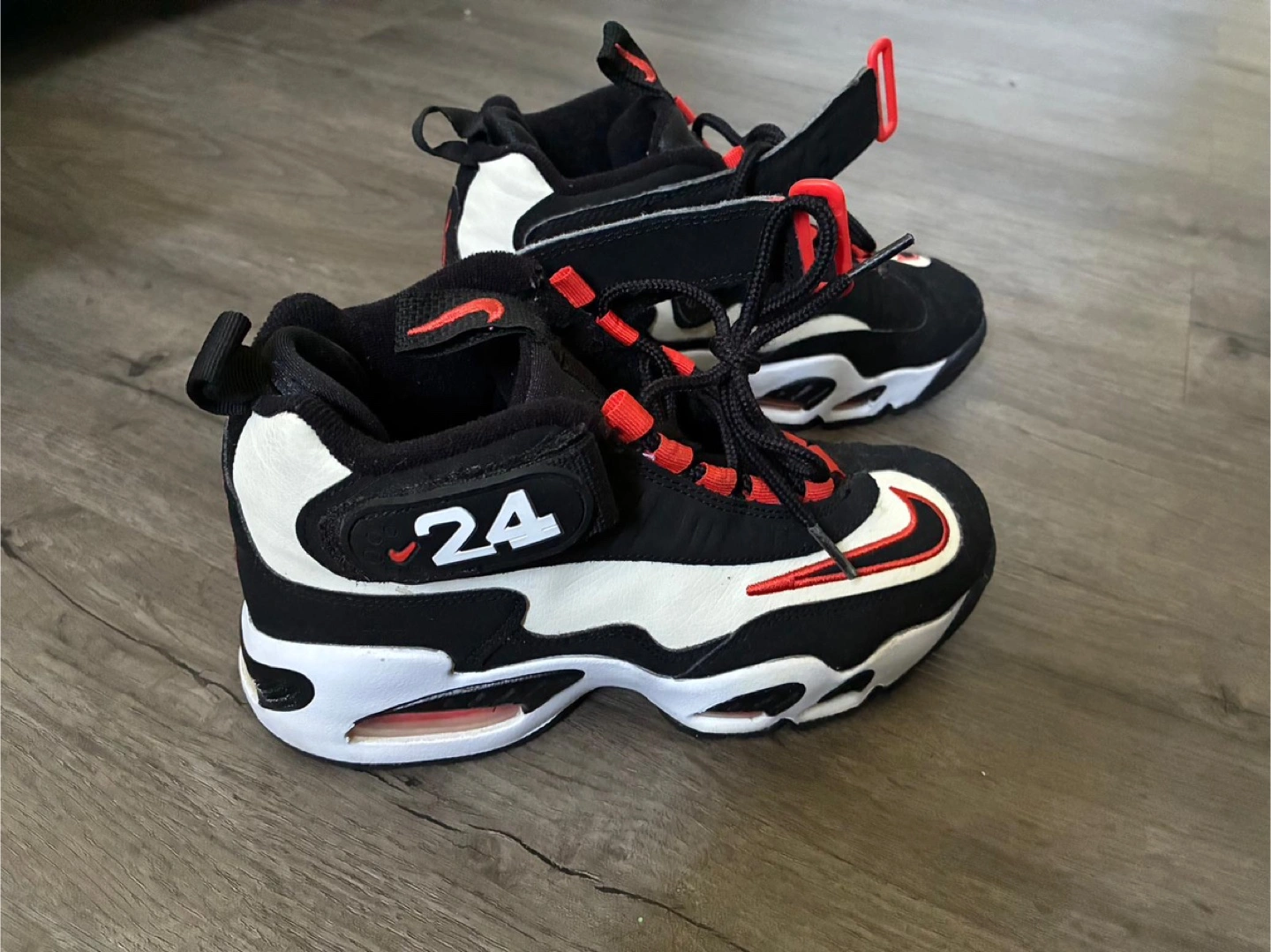 Nike Air Griffey Max 1 "The Kid" sneakers in black, white, and red. Features a strap closure and "24" detailing. Classic athletic footwear.