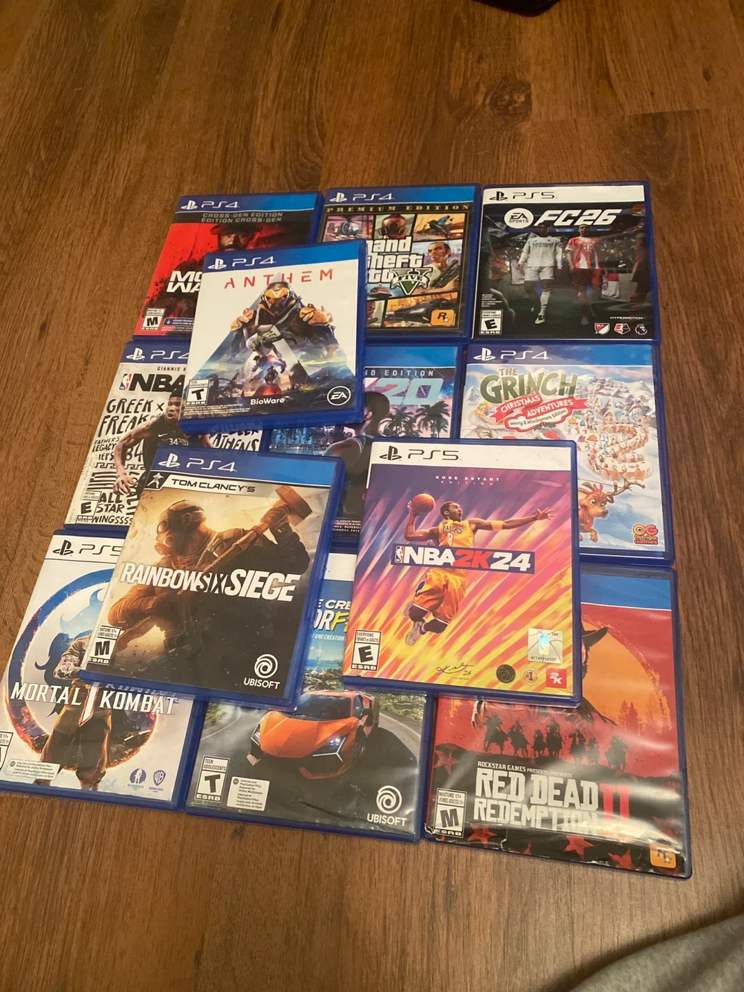 Bundle includes a variety of PS4 and PS5 video games. Titles featured are Anthem, Grand Theft Auto V, FC 24, NBA 2K24, Tom Clancy's Rainbow Six Siege, Mortal Kombat, The Grinch Christmas Adventures, and Red Dead Redemption 2. Various ESRB ratings included.