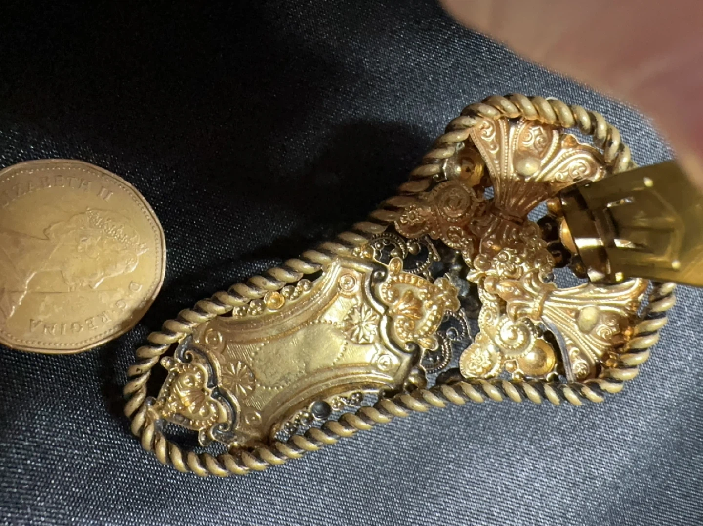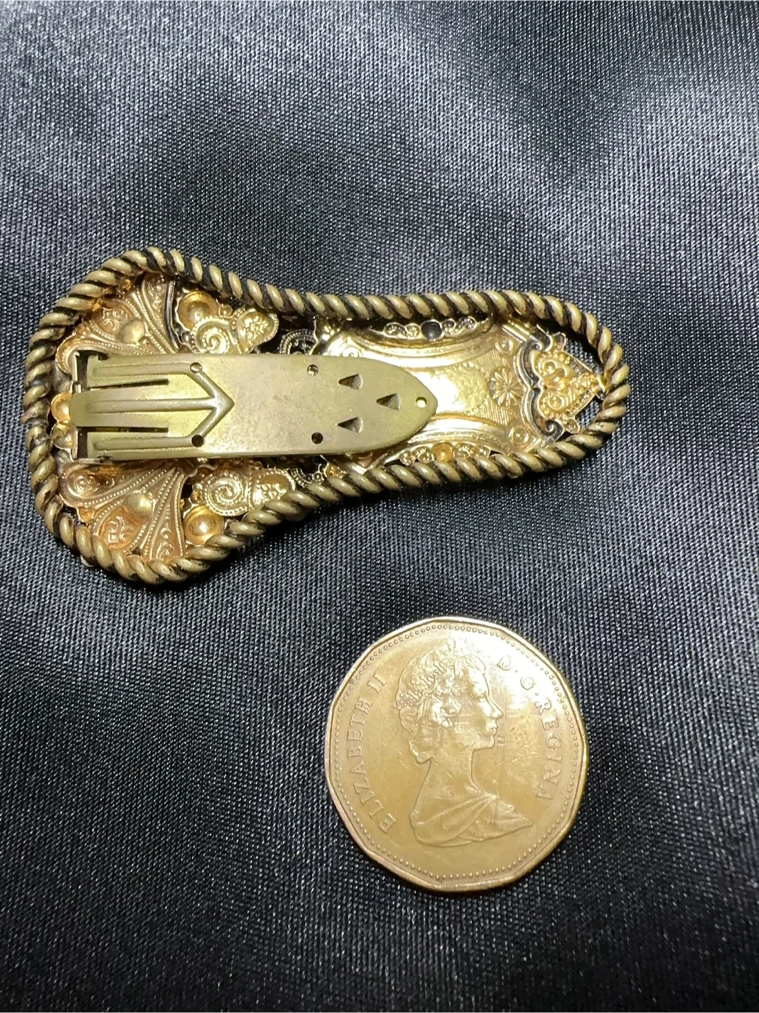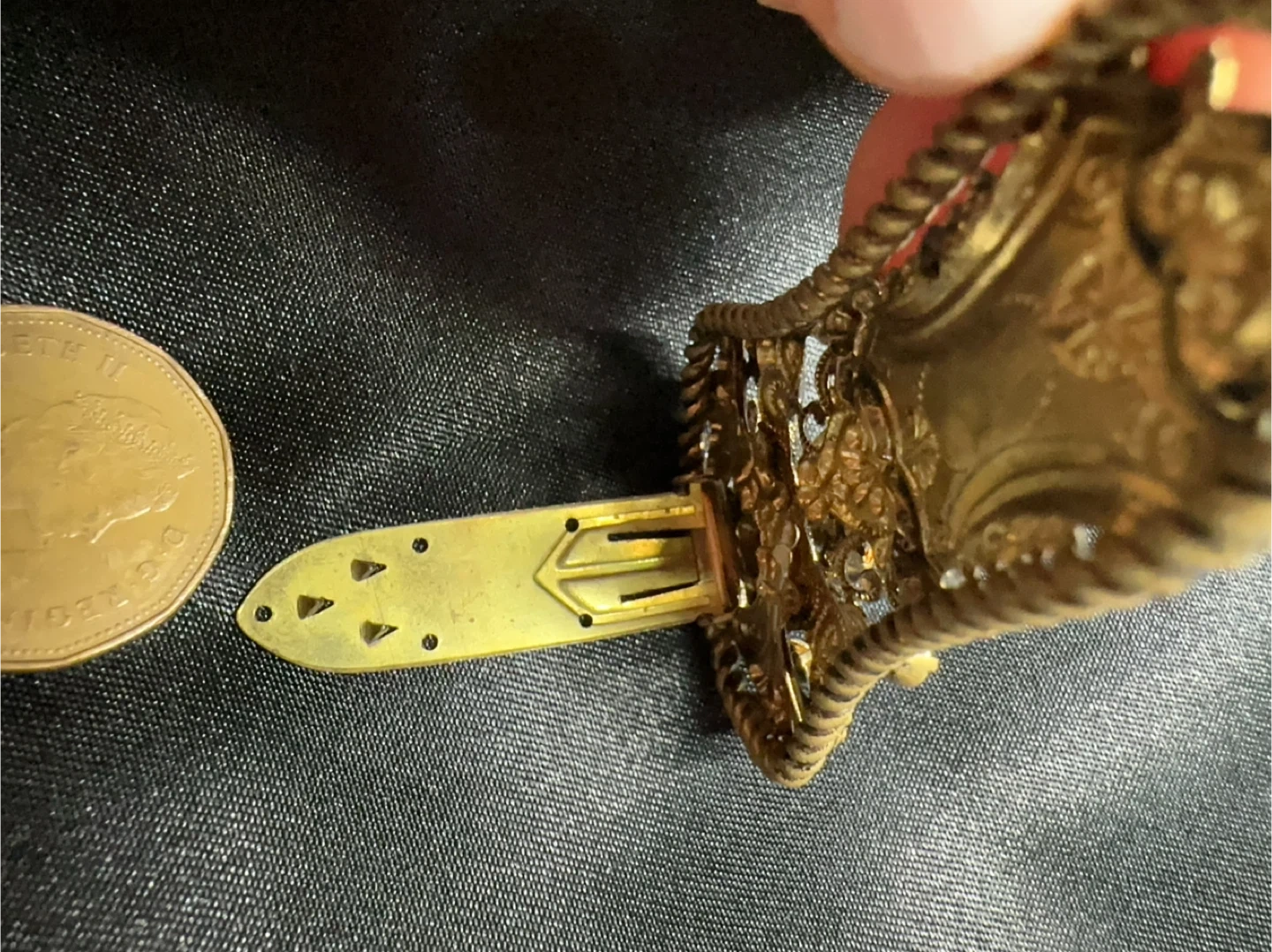 This is a beautiful vintage sash pin or brooch, possibly from the 1930s, featuring intricate filigree openwork and embellished with small, amber-coloured rhinestones. The clip features a secure clasp on the back, perfect for holding in place with an ornate, antique-style design.
