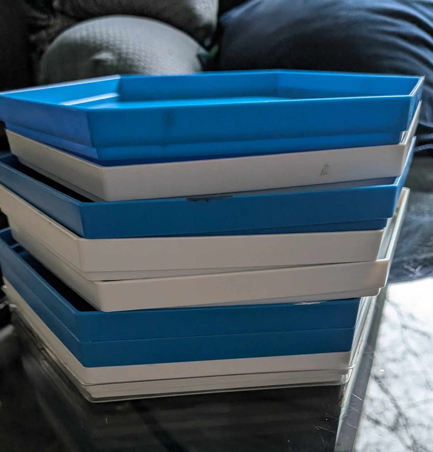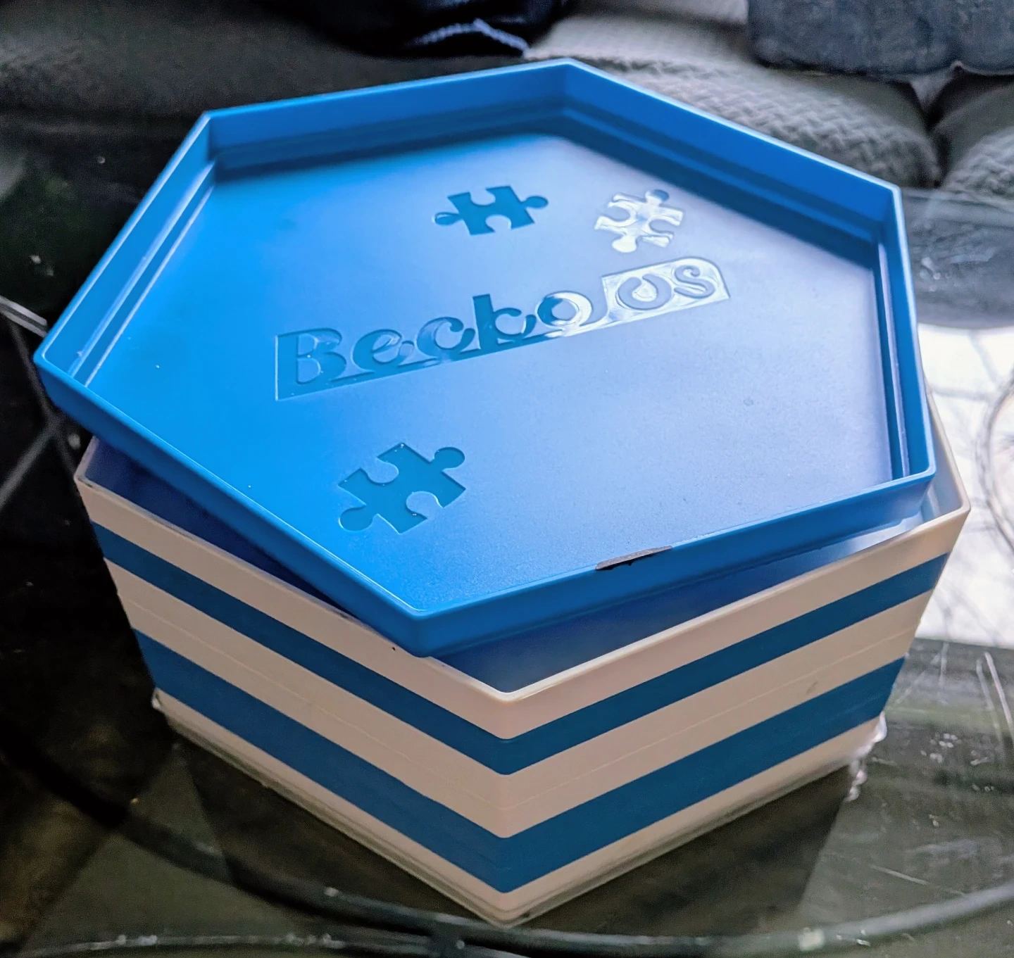 Set of Beckooos hexagonal puzzle trays in blue and white. They're great for sorting puzzle pieces. Includes multiple trays for organized puzzling! I personally used them for my paint stencils and they stack perfectly and there is a clear lid for the top but it's not visible in these photos sorry
