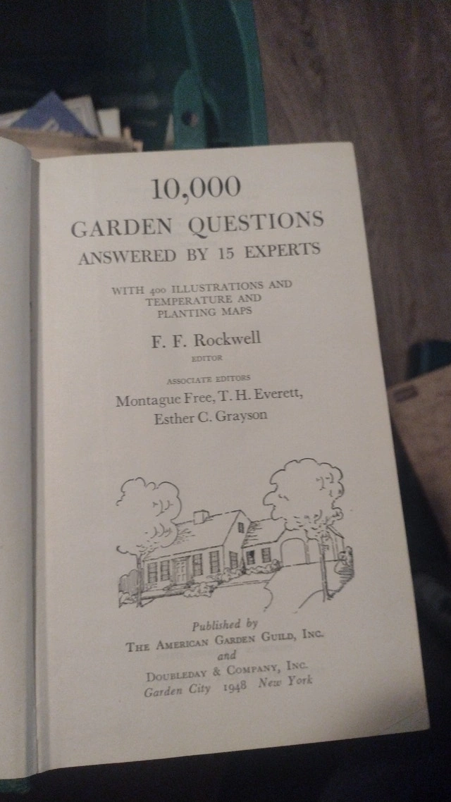 This is a vintage hardcover book titled 10,000 Garden Questions Answered by 15 Experts, edited by F. F. Rockwell and published by Doubleday. The book is a classic horticulture guide offering a wealth of information on everyday gardening problems. It covers various topics, including vegetable patches, fruit trees, houseplants, and regional garden issues. The edition in the image appears to be an earlier version, as some later editions were updated to include answers from 20 experts. Condition: Used - Good. Owner for sale. Curbside pick up available. Cash accepted.