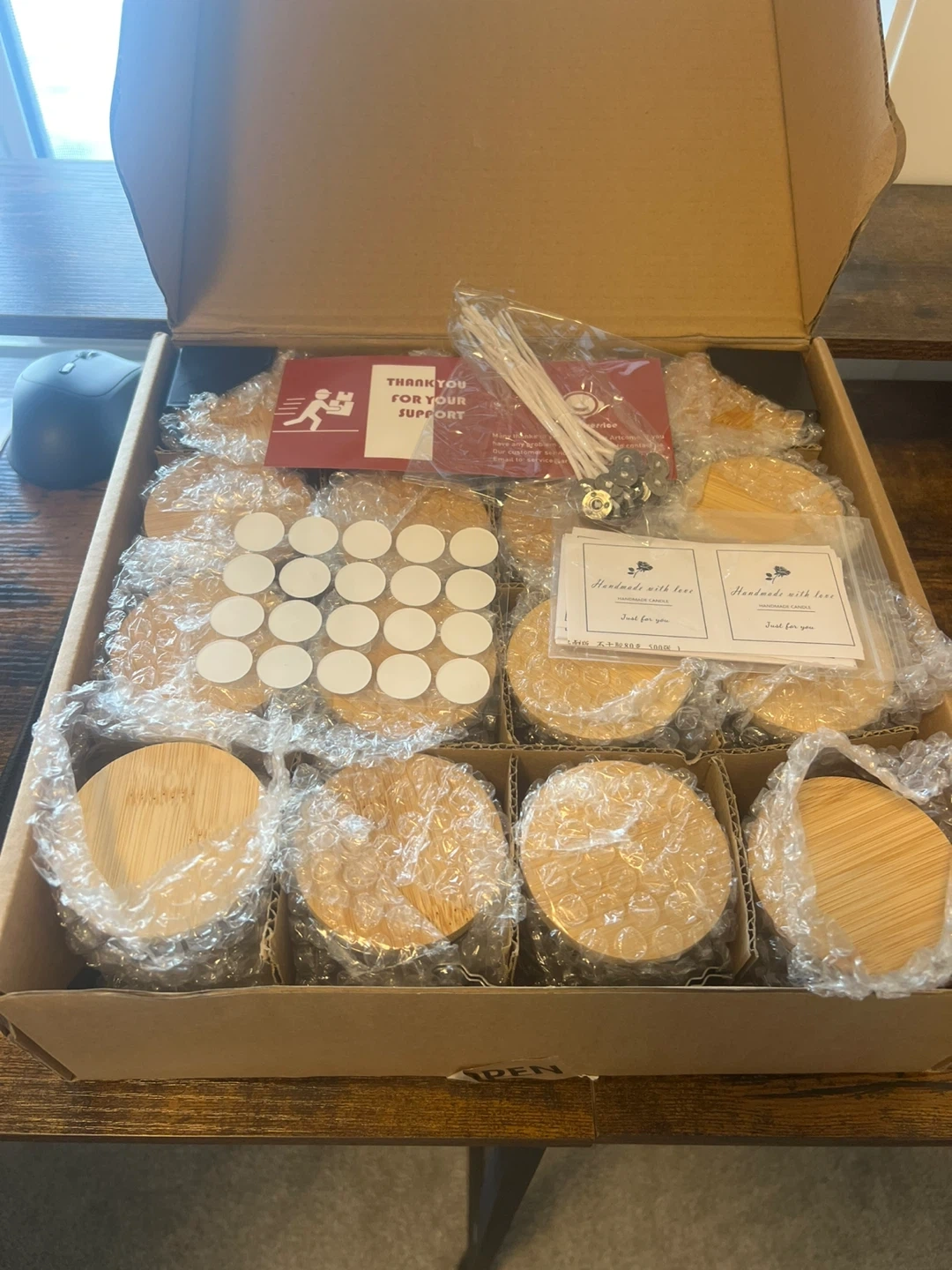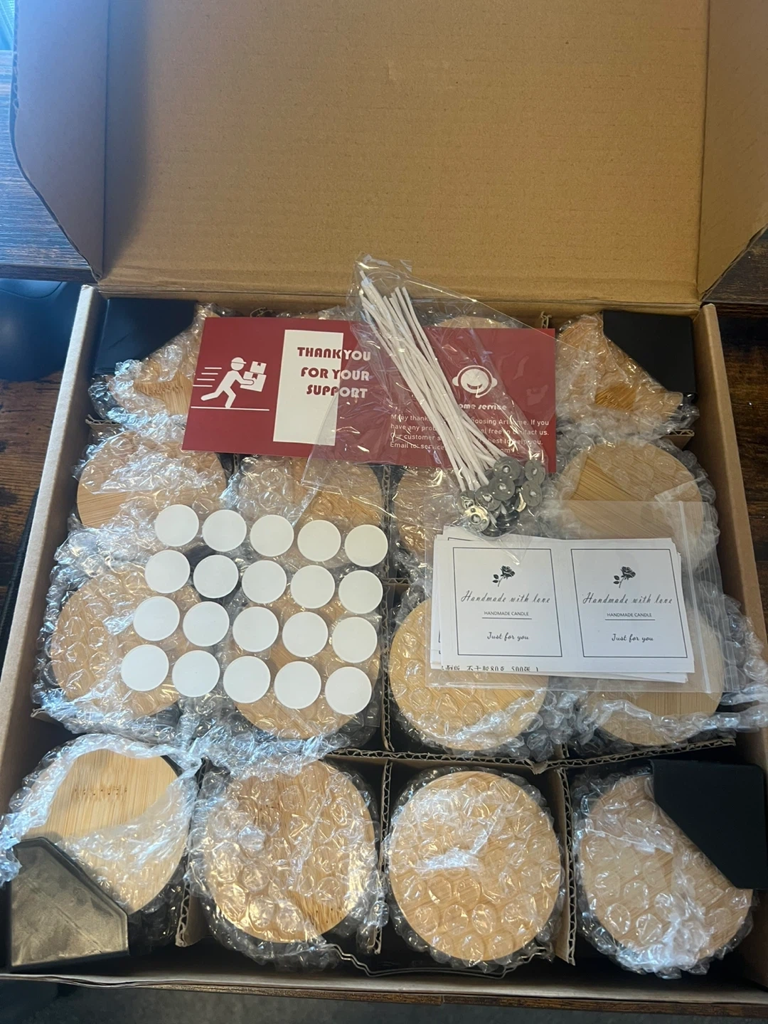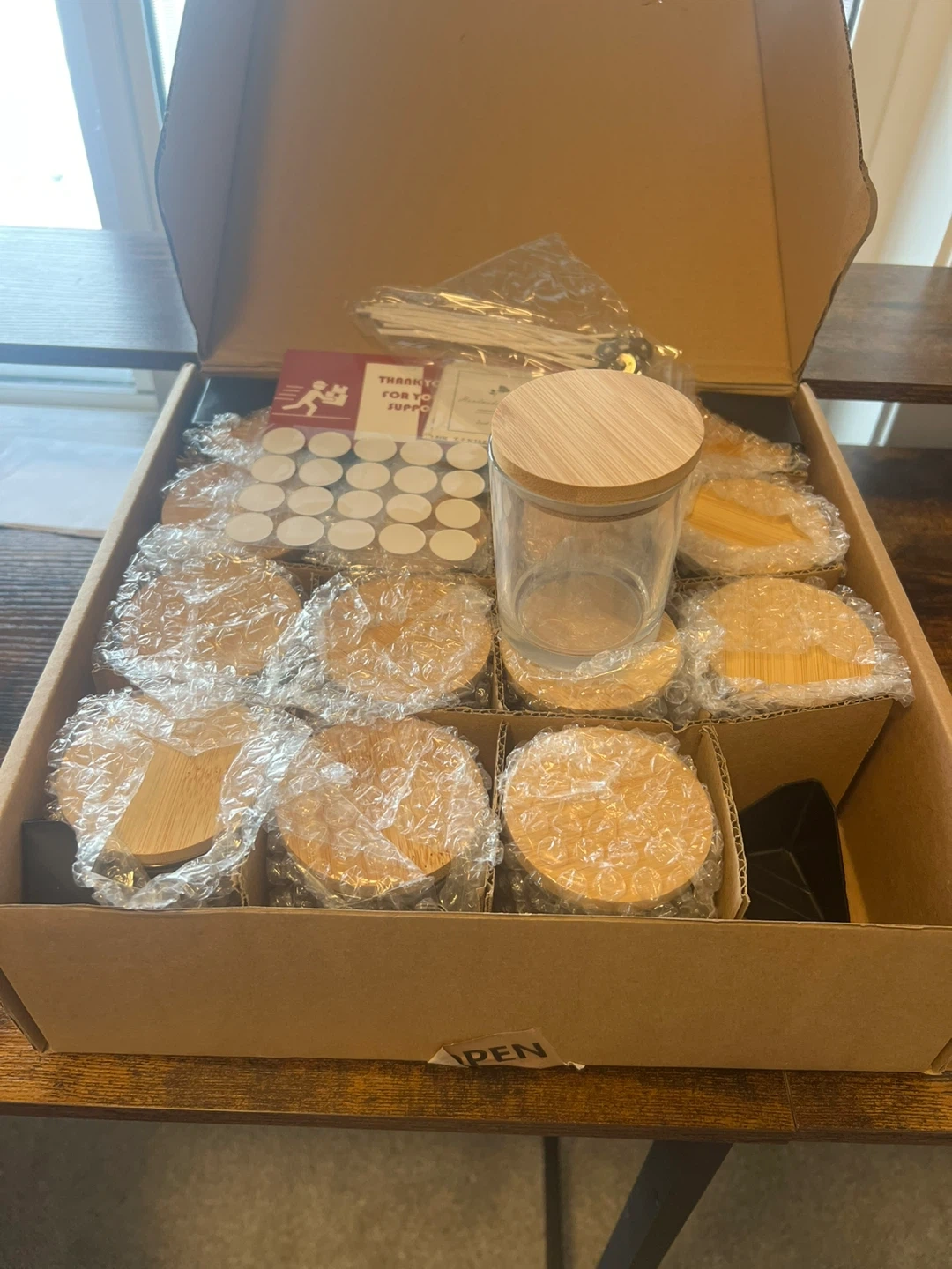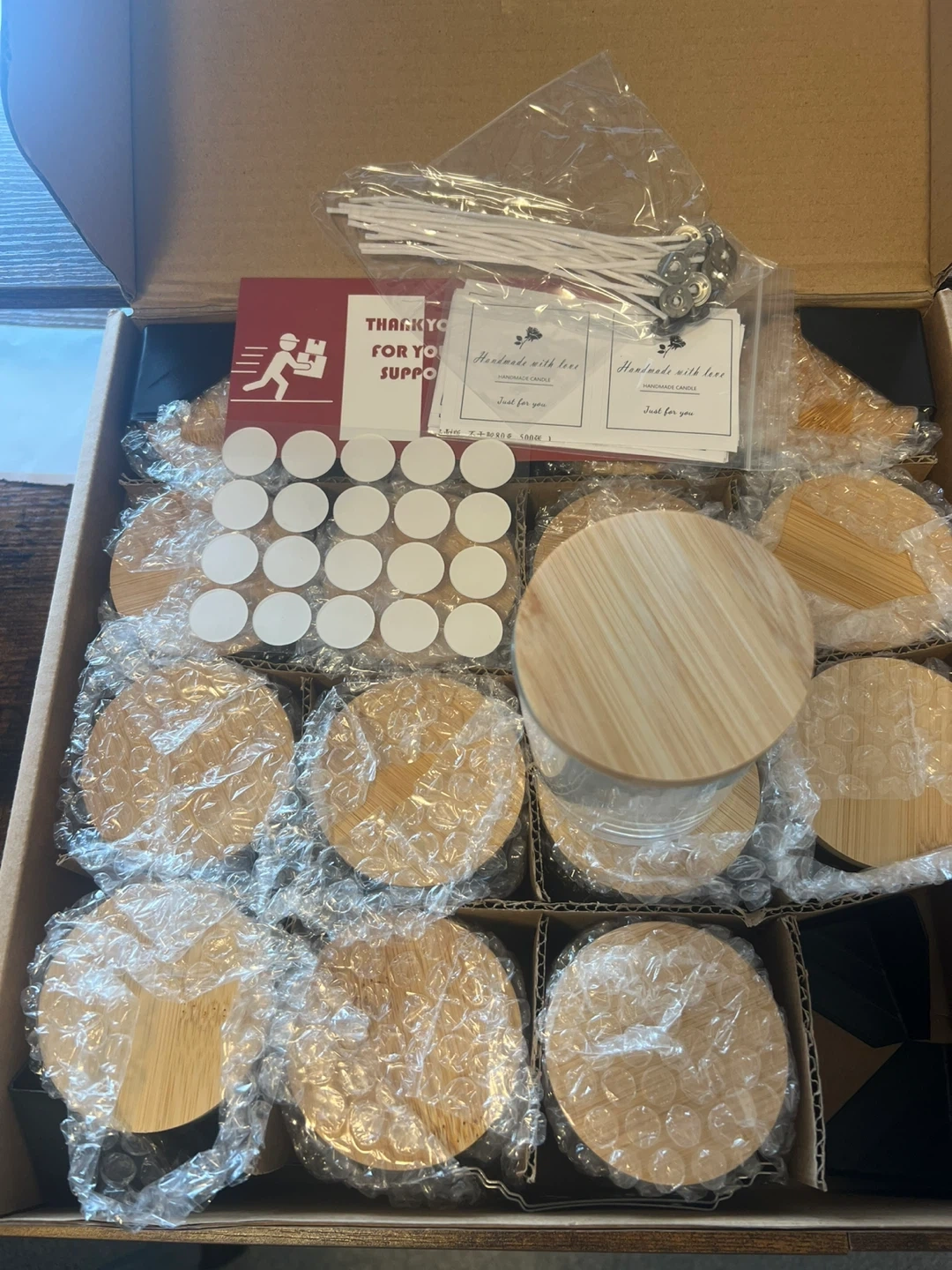 This kit includes 16 glass candle jars with bamboo lids, perfect for DIY candle making. It also comes with wicks, wick stickers, and other accessories to get you started. Create your own custom candles at home! Brand new.