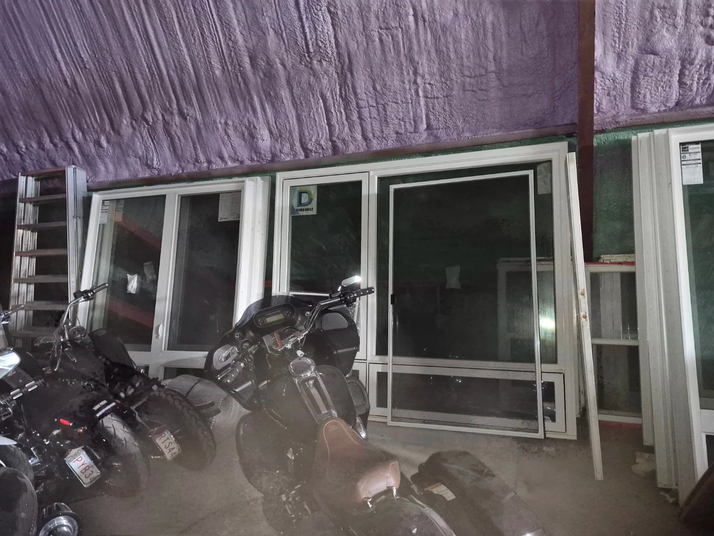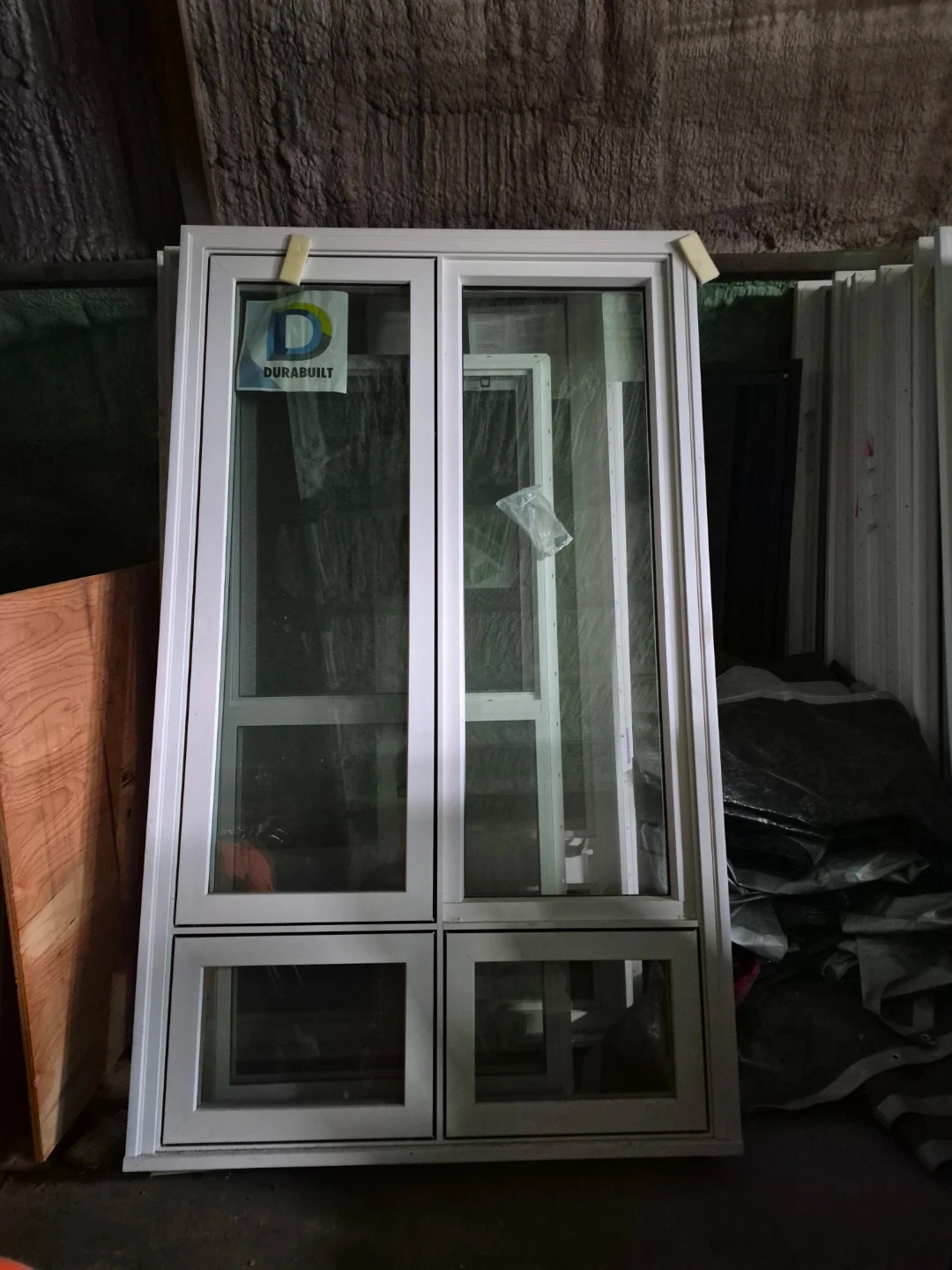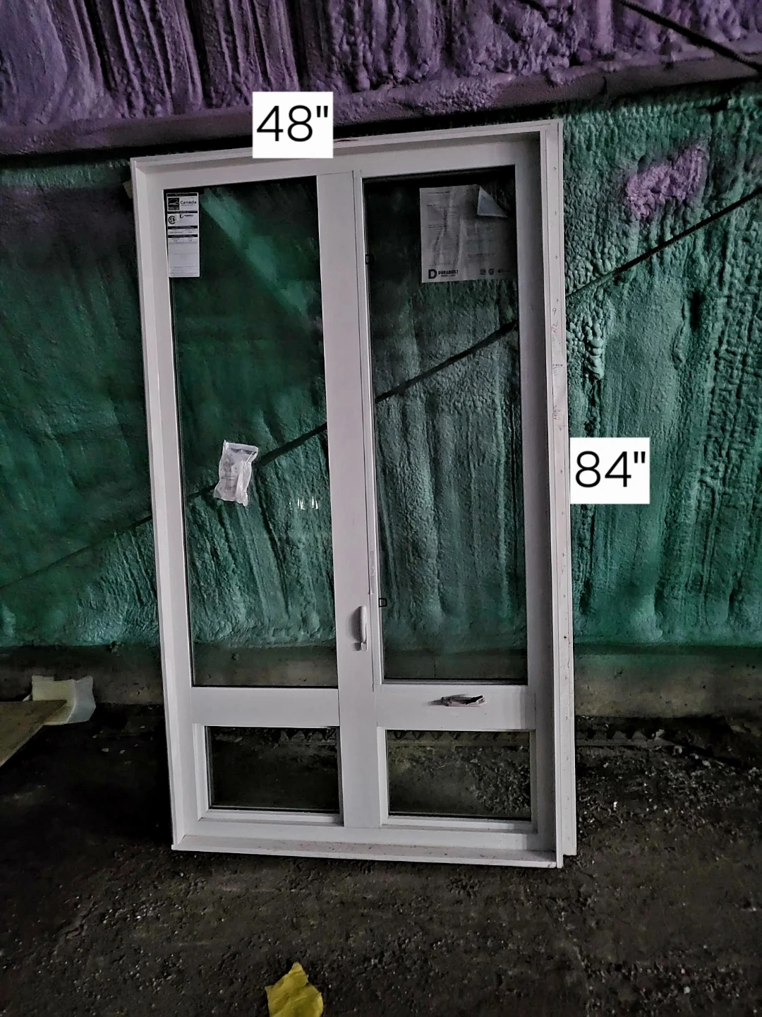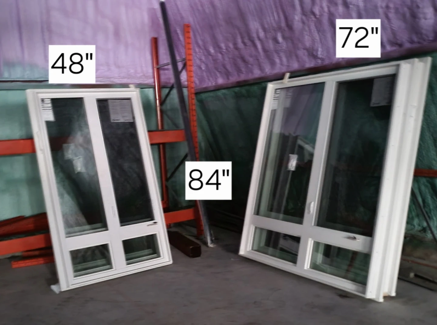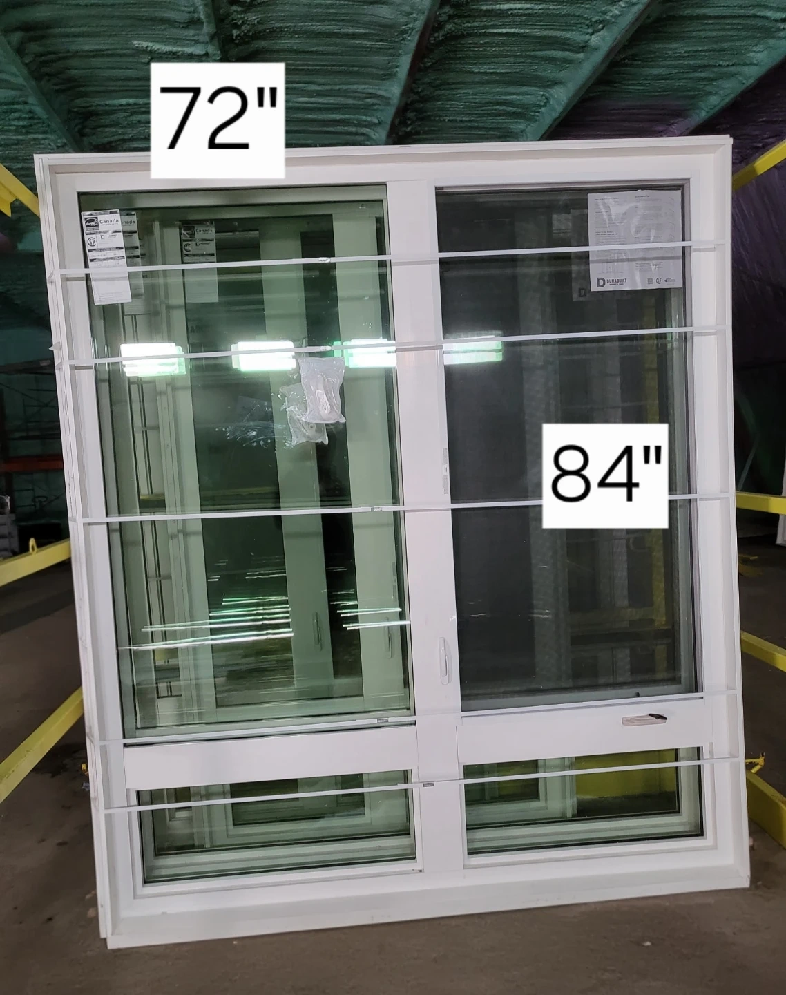 Brand new Durabuilt white vinyl windows with brick mold, available in various sizes. Dimensions include 48"x84" ($800), 72"x84" ($1200), and 96"x84" ($1500).