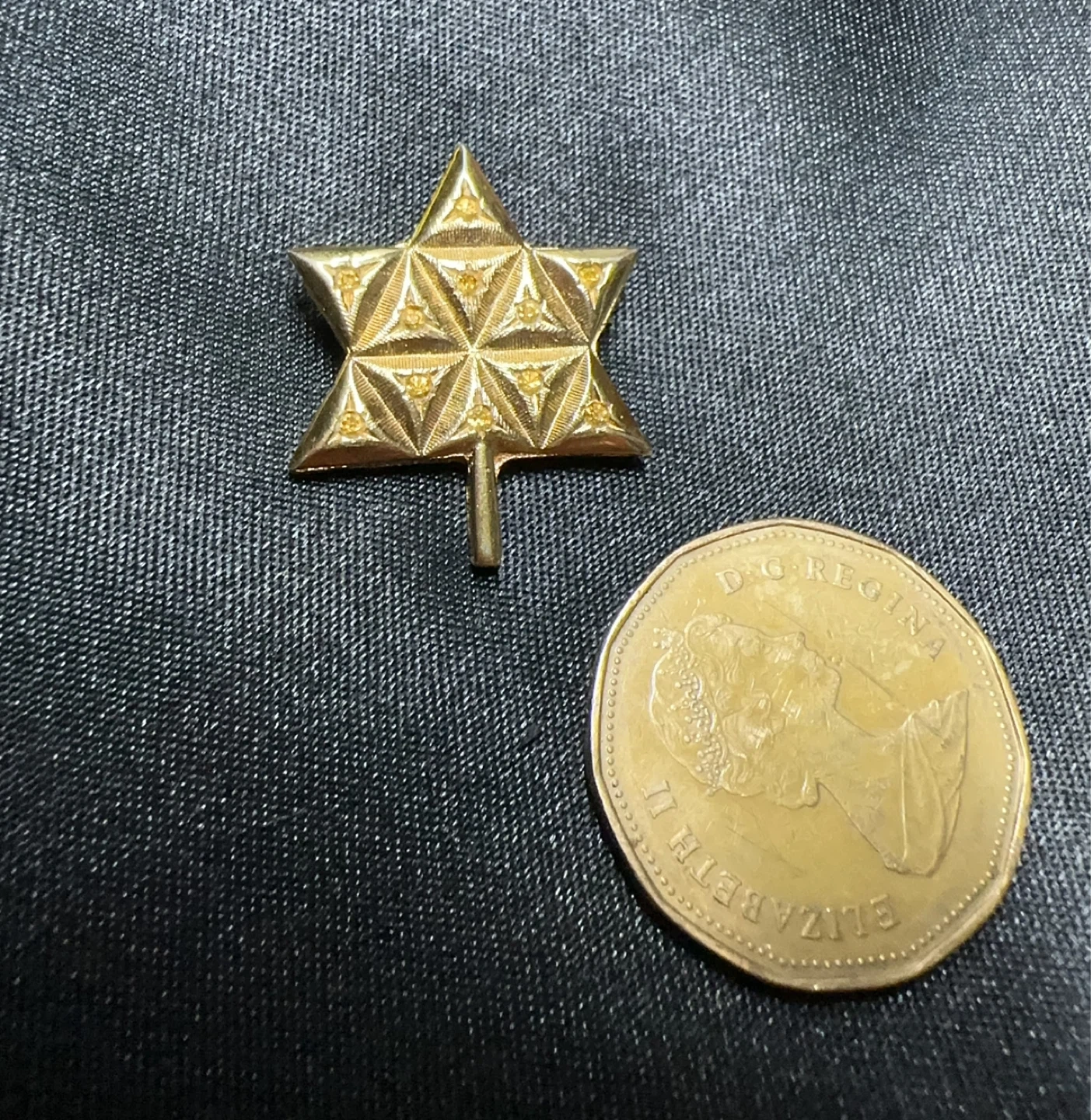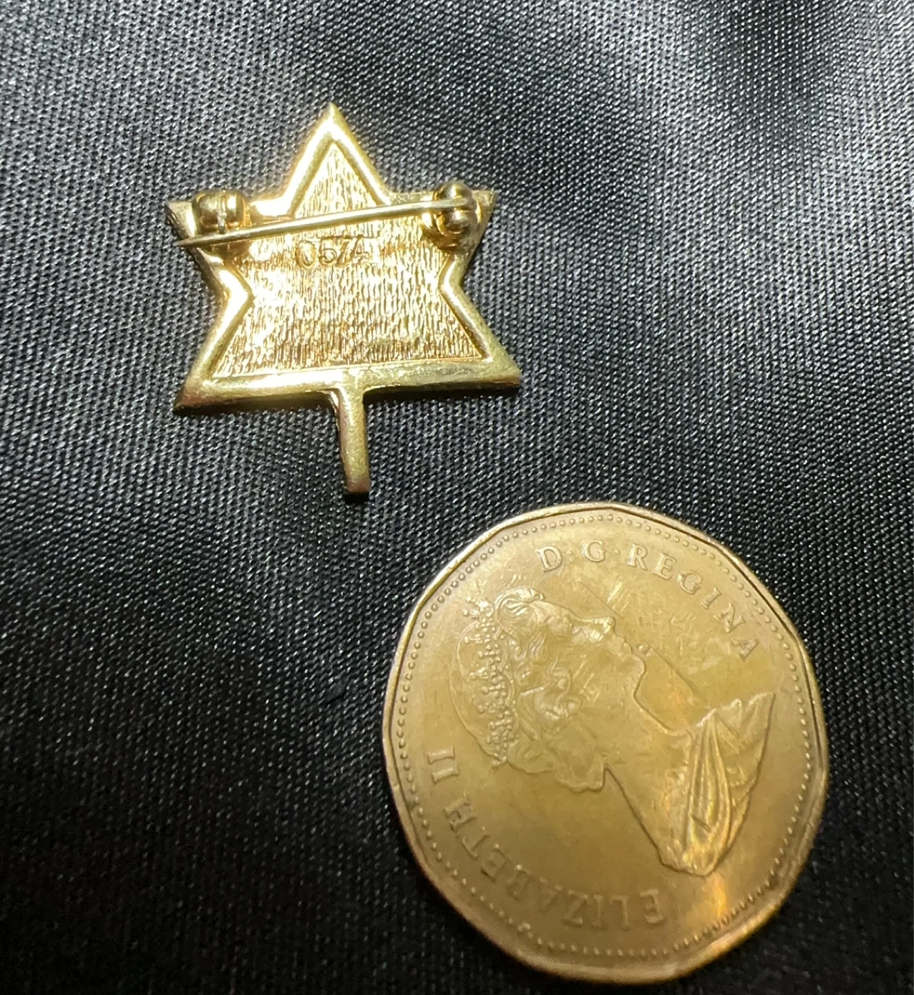 A gold-toned star-shaped lapel pin. It has a textured design with small triangular accents. Fastens with a pin closure.