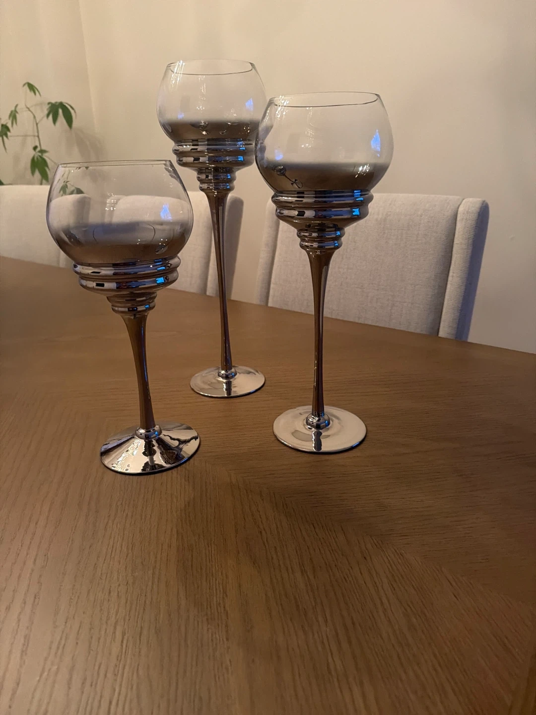 A set of three decorative candlesticks with a silver-tone finish. These pieces feature glass globes atop polished metal stems and bases. They're suitable for taper candles and add a touch of elegance to any room.