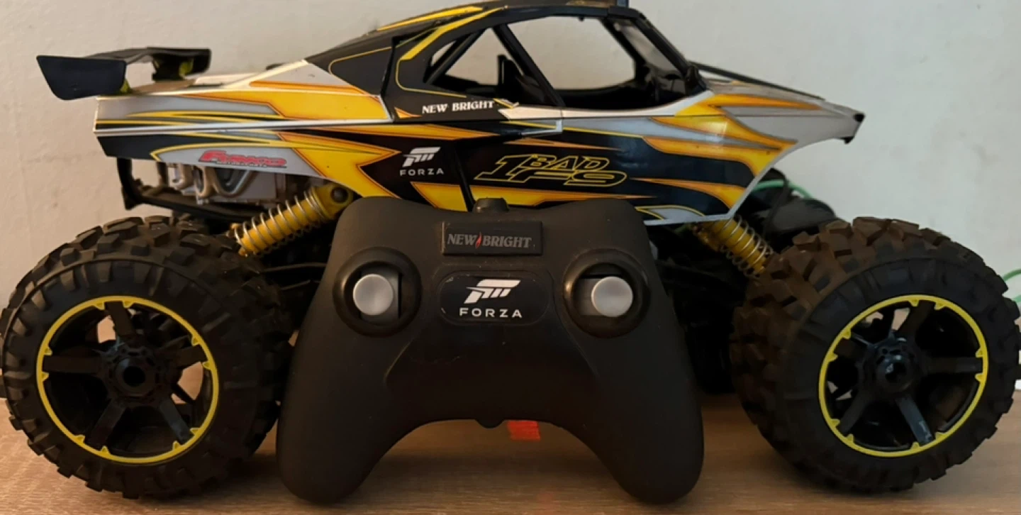 This is a New Bright Forza 4x4 Forza Buggy with a remote control. It's a cool toy for off-road fun. The truck features a yellow, black, and silver design with large, rugged tires just seeing if there any interest in it doesn’t get used around here anymore