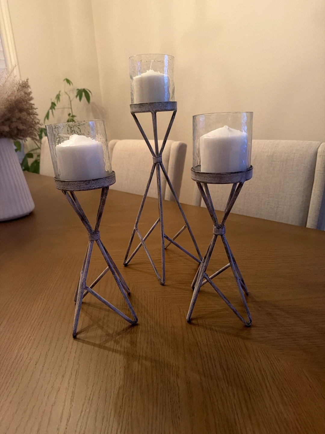This set includes three metal candle holders with glass hurricanes. They have a distressed white finish and a tripod base. Candles are included.