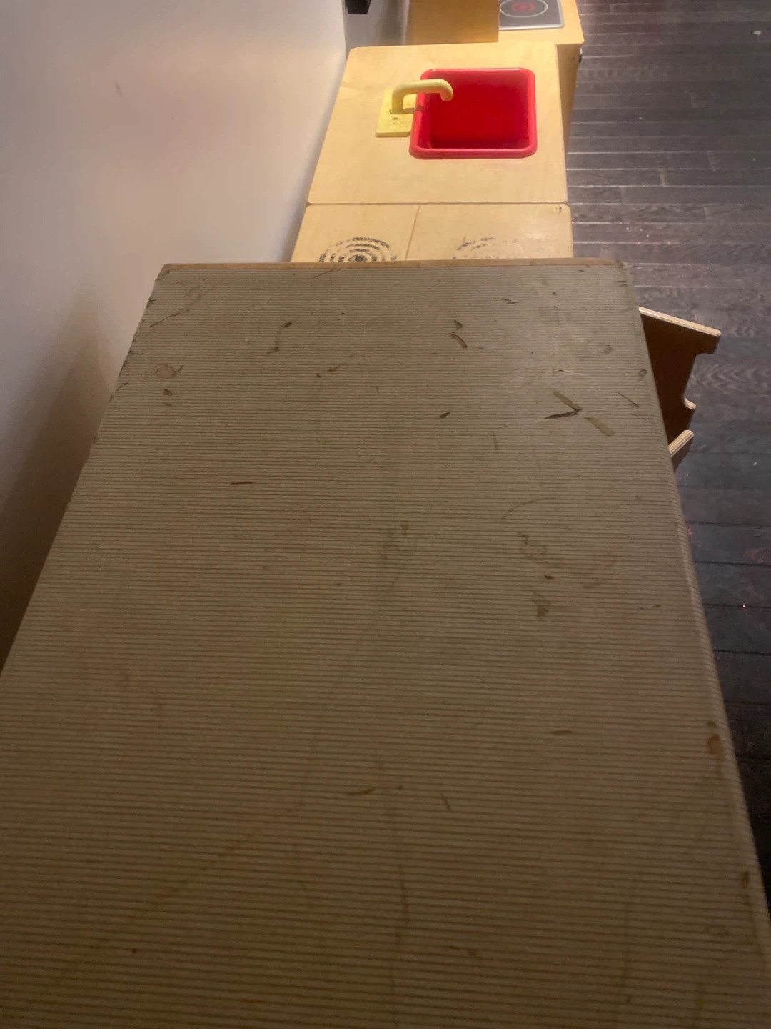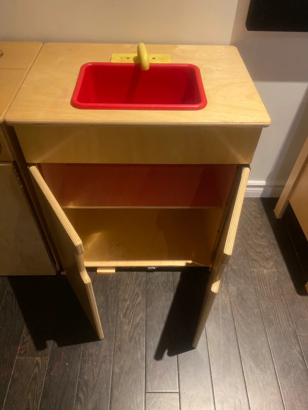 Used solid wood play kitchen set with a fridge, sink and stove features. It's made of natural wood and includes red knobs for the stove. The set has a cupboard and a cabinet for storage. Great for imaginative play! Daycare approved.