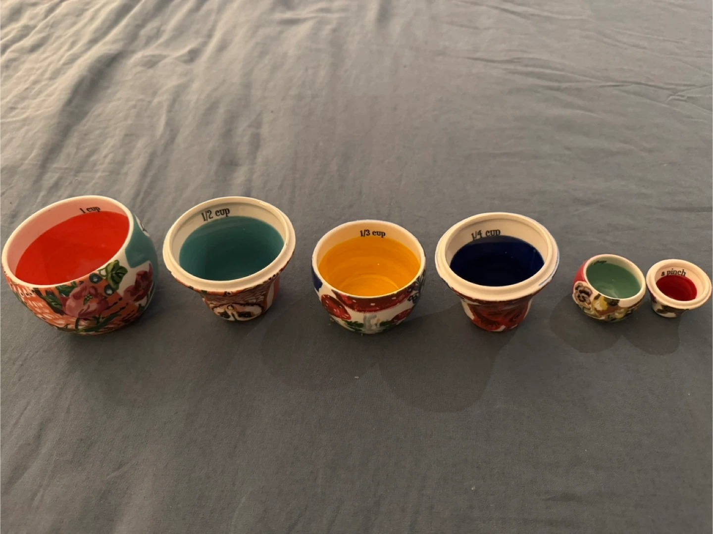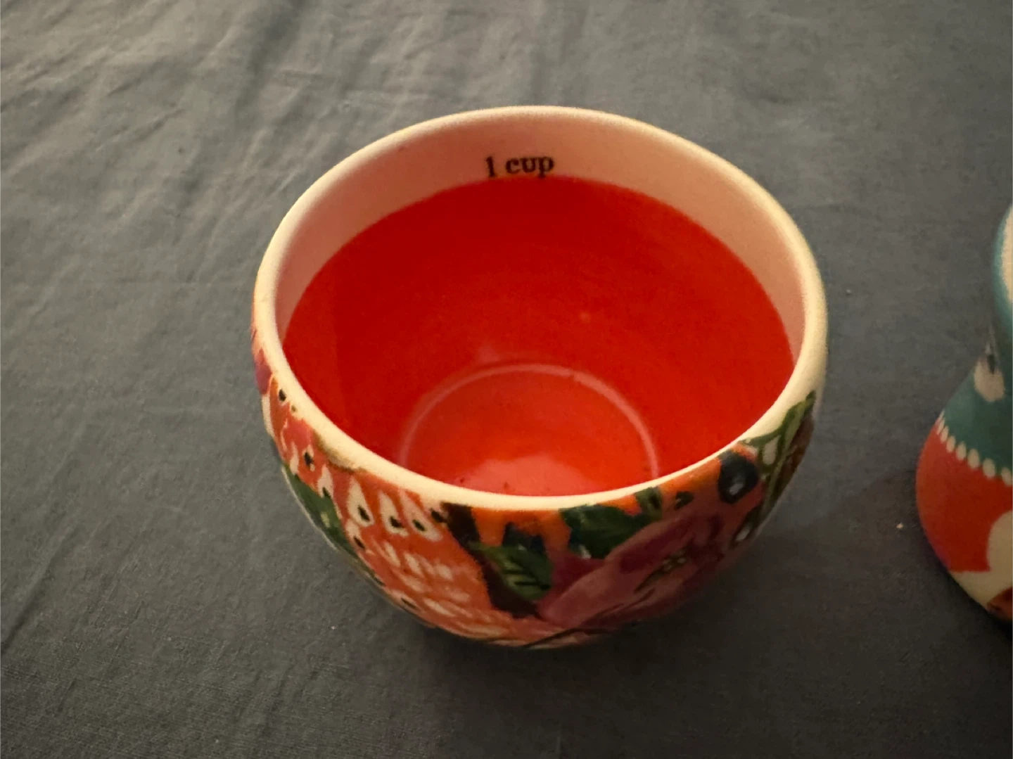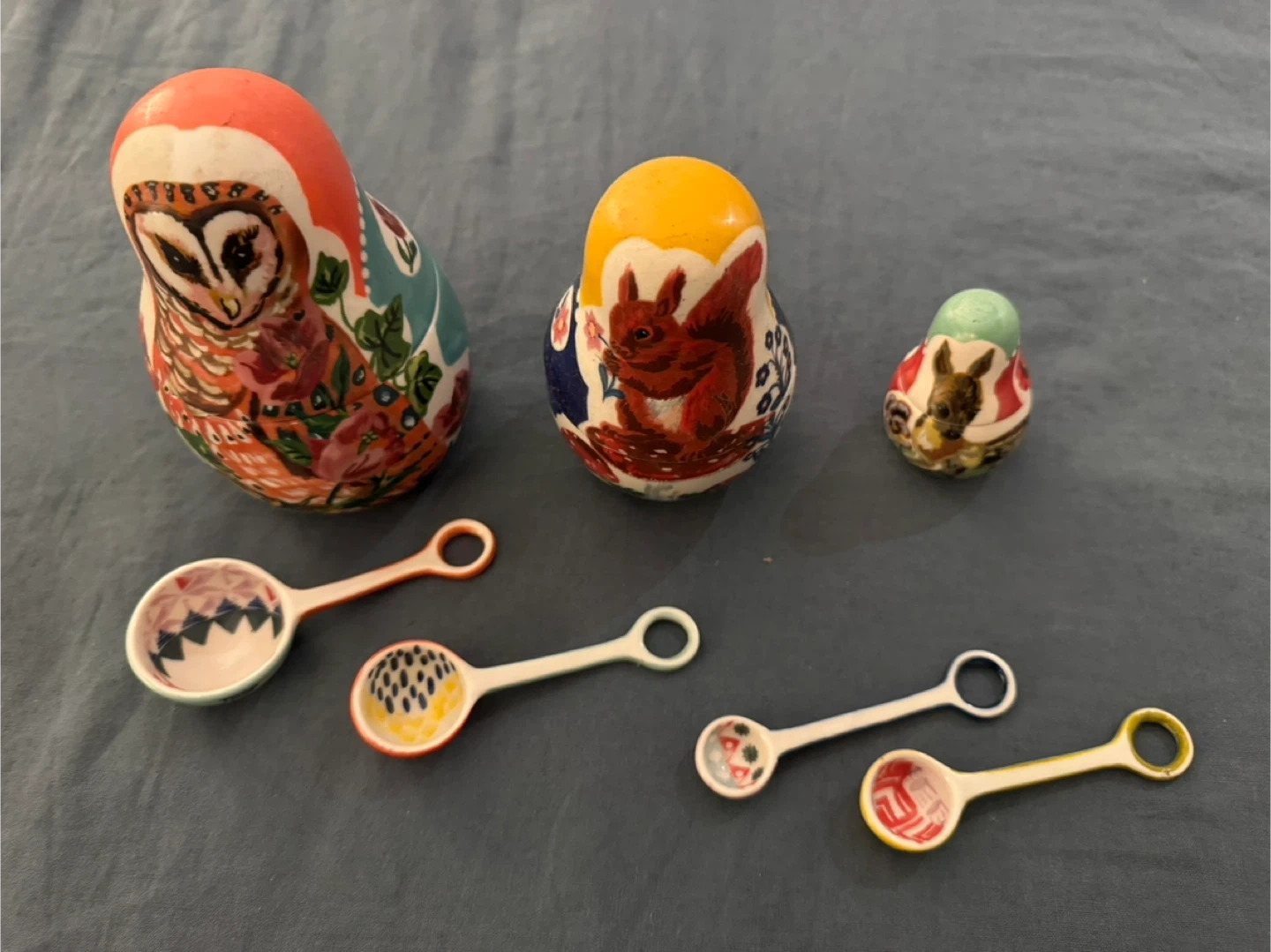 Set of nesting decorative measuring cups and spoons. Features a matryoshka doll style with owl and squirrel designs. Includes measuring cups for 1 cup, 1/2 cup, 1/3 cup, and 1/4 cup. Also includes spoons marked T BSP, 1/2 TSP, and 1/4 TSP. These would be lovely for display or gentle kitchen use!
