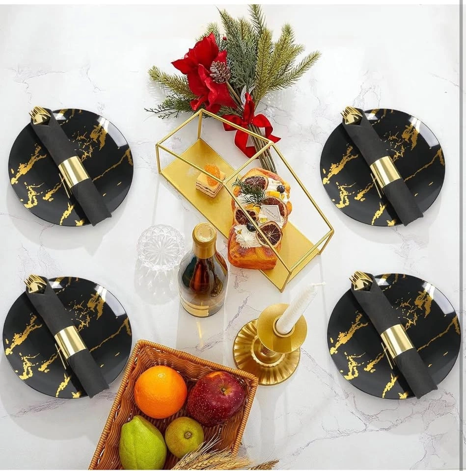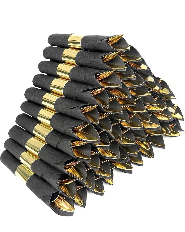 This is a 100-pack of pre-rolled gold plastic silverware sets, each including a fork, spoon, and knife, along with a black napkin. They are made from food-grade, BPA-free plastic and are designed to be sturdy and durable. The elegant gold finish gives them a metallic look, perfect for adding a touch of class to any event. They are disposable for easy cleanup, but can also be washed by hand for reuse. Not recommended for microwave, oven, or dishwasher use. Great for parties, weddings, banquets, holidays, picnics, and everyday meals. Let me know if you're interested!