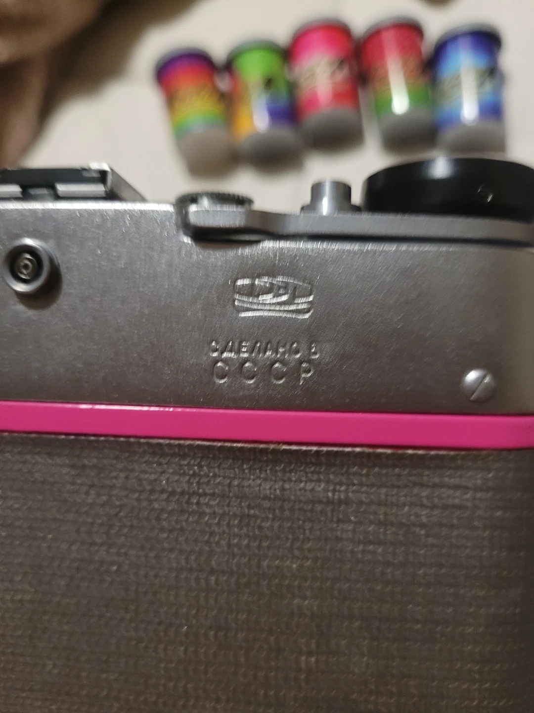 Two 35mm film cameras, both manufactured in the USSR. They have pink accents and come with lenses. Includes five rolls of VODICA film, including Andromeda, Callisto, and Polaris.