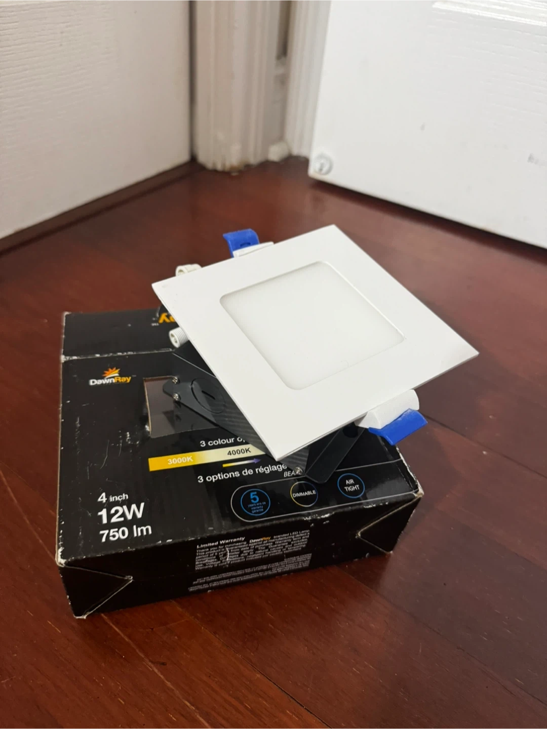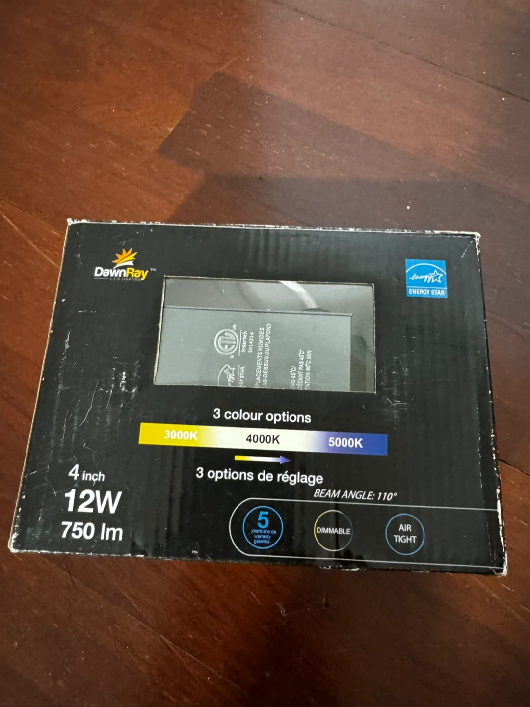This DawnRay LED pot light is 4 inches wide and provides 750 lumens of light. It offers 3 colour options: 3000K, 4000K, and 5000K. It's also dimmable and air-tight. Perfect for updating your home's lighting!