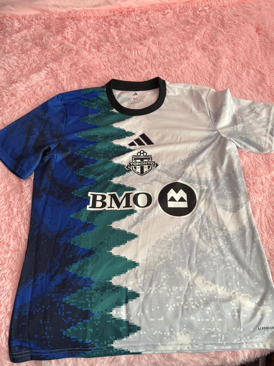 This Adidas soccer jersey features the Toronto FC crest and BMO sponsorship. It's made with Aeroready material for breathability. Great for game days or casual wear!