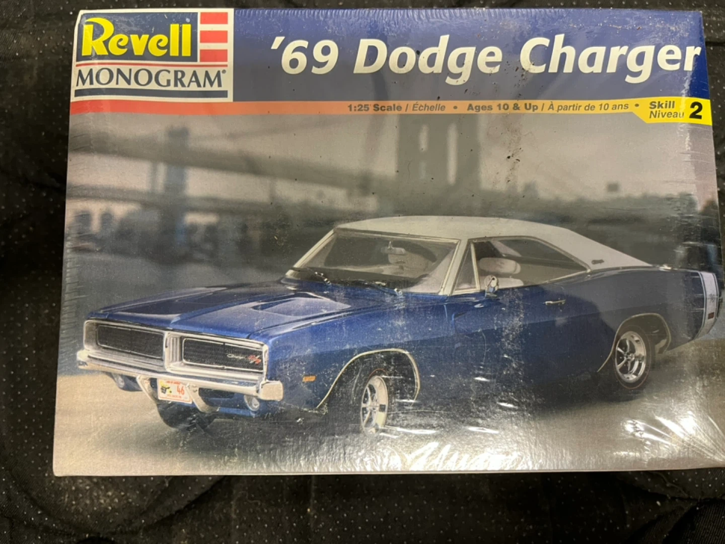 This is a Revell Monogram 1:25 scale model kit of a '69 Dodge Charger. It's for ages 10 and up with a skill level of 2. Paint and cement are not included.