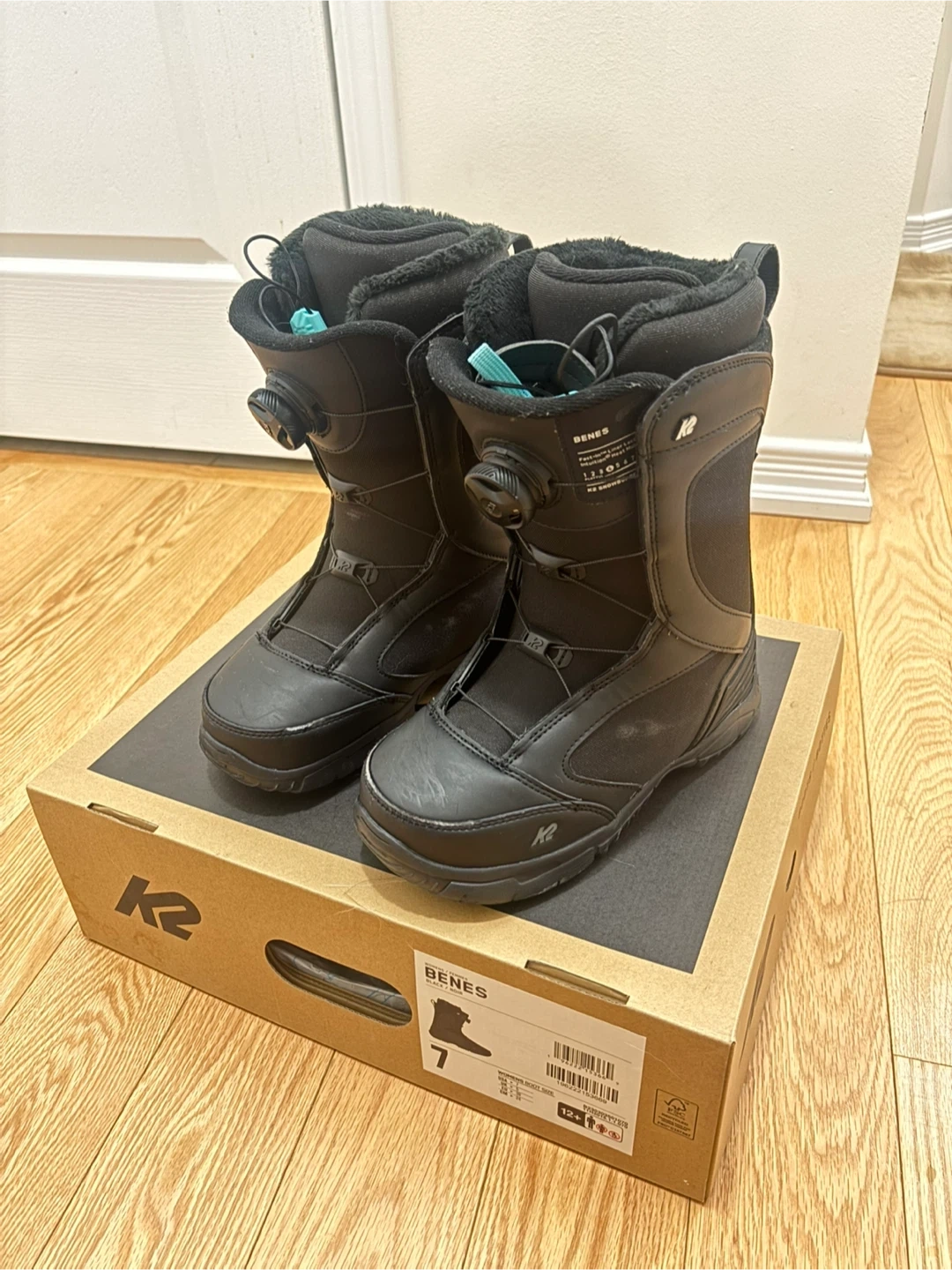These K2 Benes snowboard boots are black and feature a BOA lacing system for a secure fit. They include the original box. Size is 7.