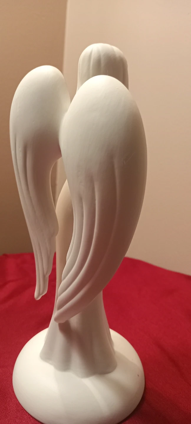 A lovely white angel figurine with delicate gold accents on its chest and heart-shaped wings. Its serene pose makes it a beautiful decorative piece. Ceramic material.
