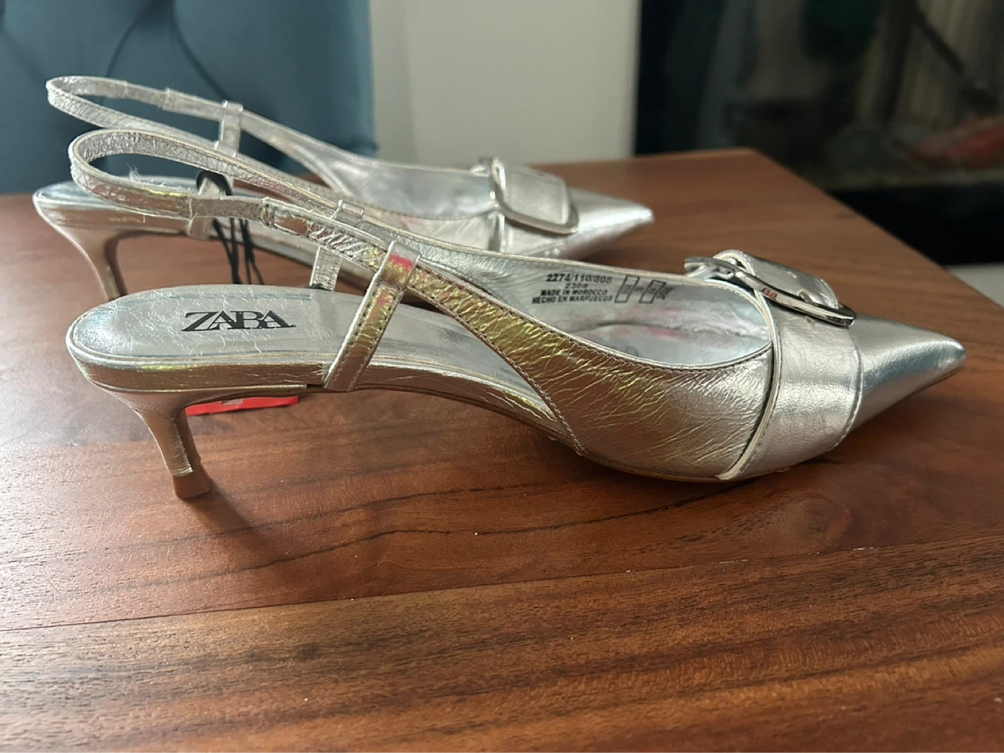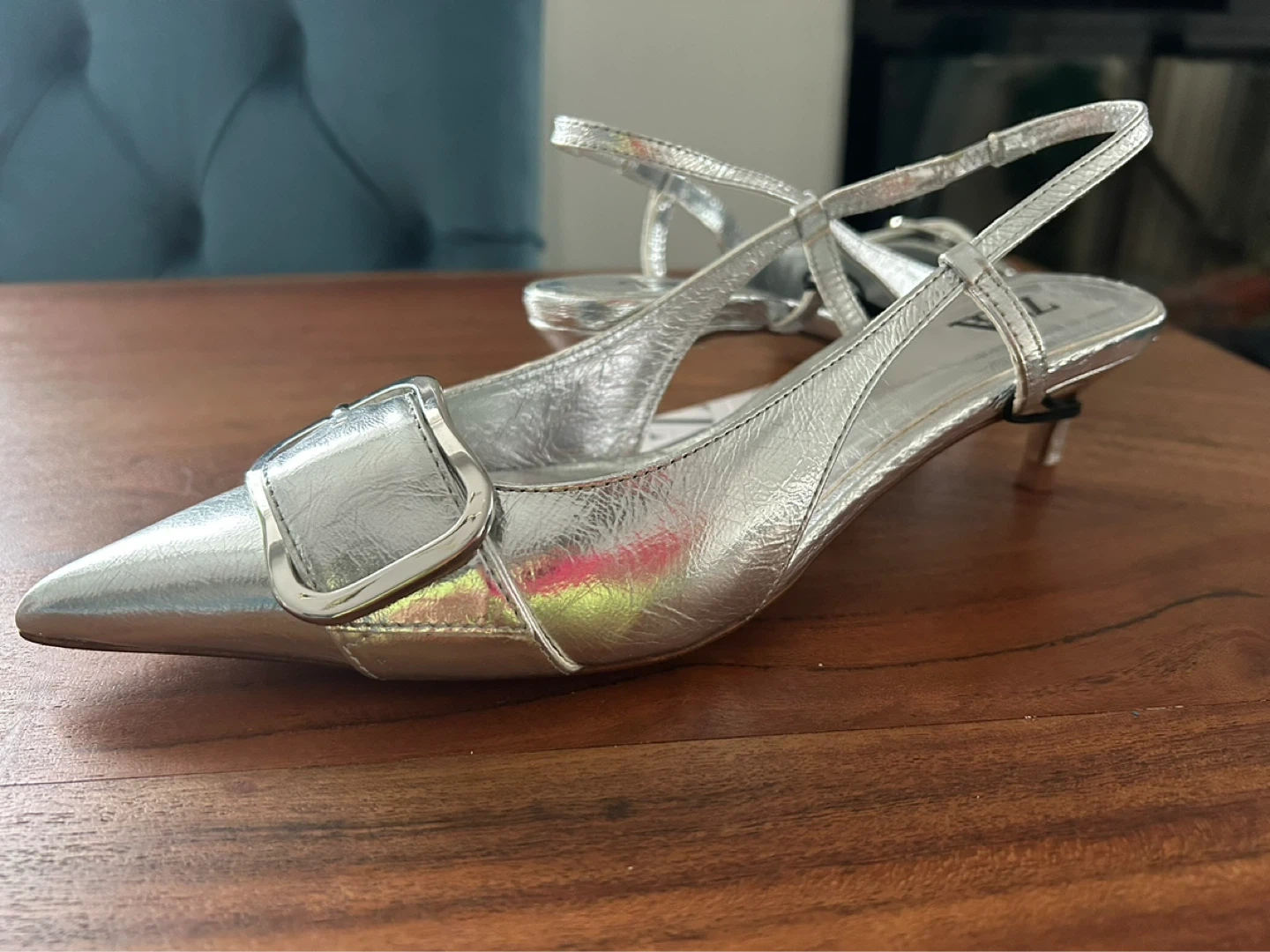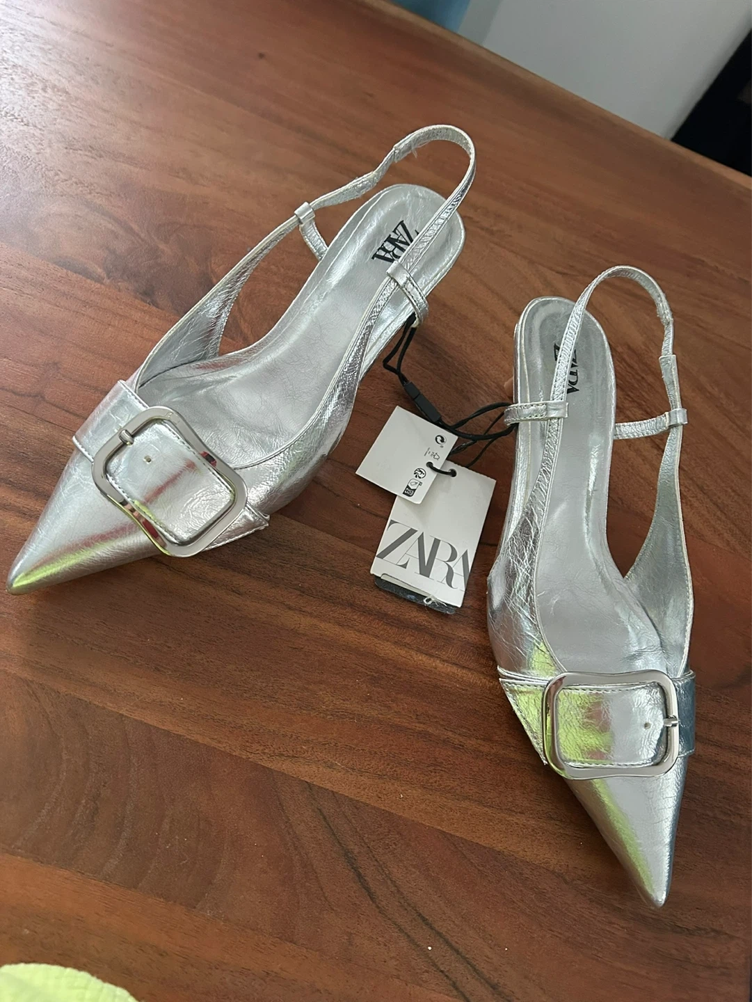 These ZARA slingback heels are a stylish silver colour. They feature a decorative buckle on the pointed toe and an adjustable ankle strap. Slingback design.