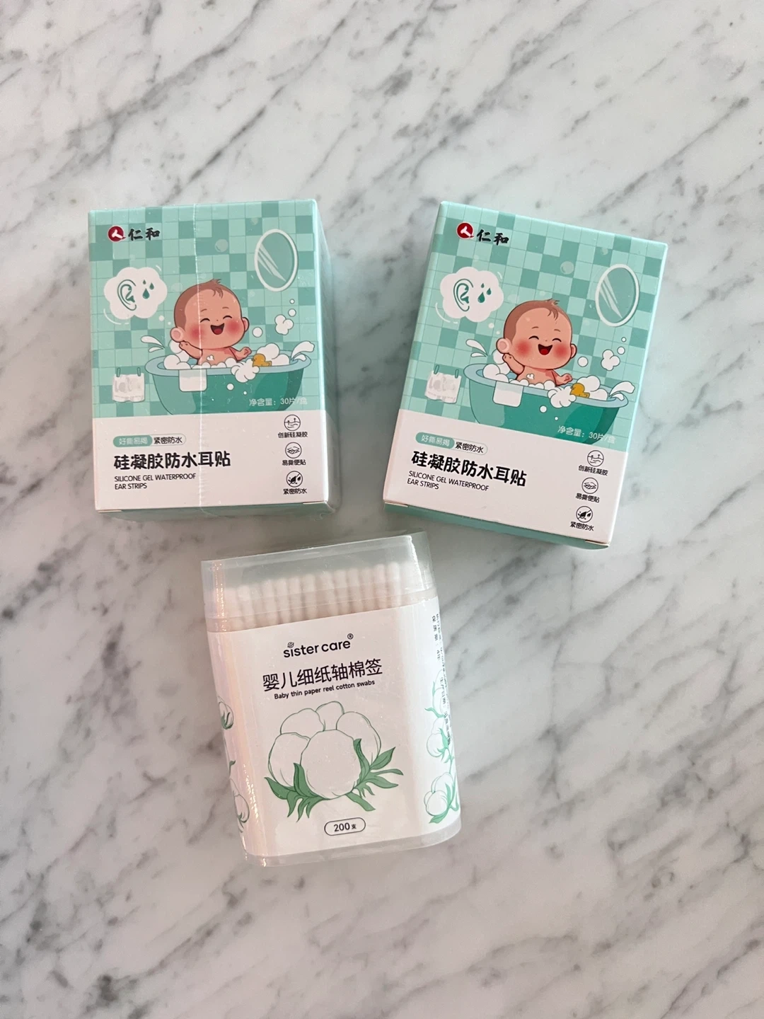 This bundle includes a container of baby thin paper reel cotton swabs, with 200 swabs. It also comes with 2 boxes of 30-count silicone gel waterproof ear strips. (1 box is open and used only 2 pieces) These ear strips are designed to be a snug, waterproof fit for baby bath.