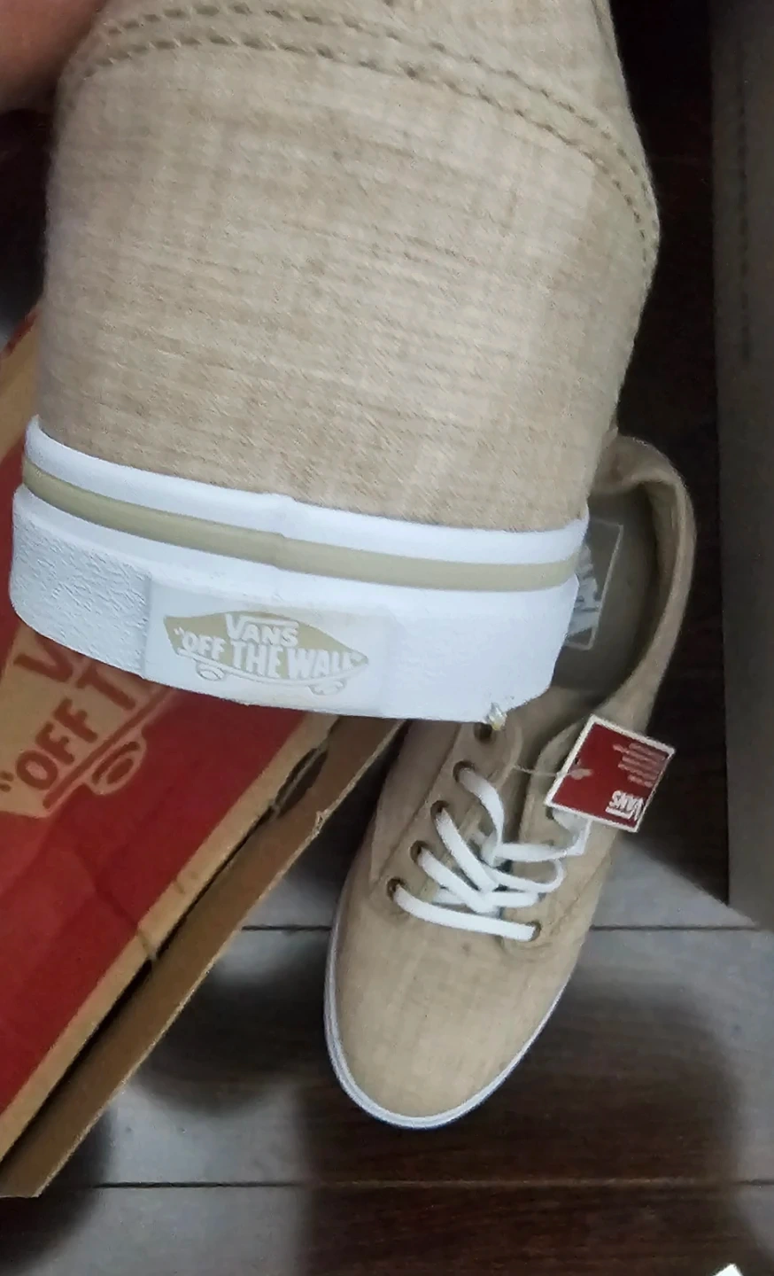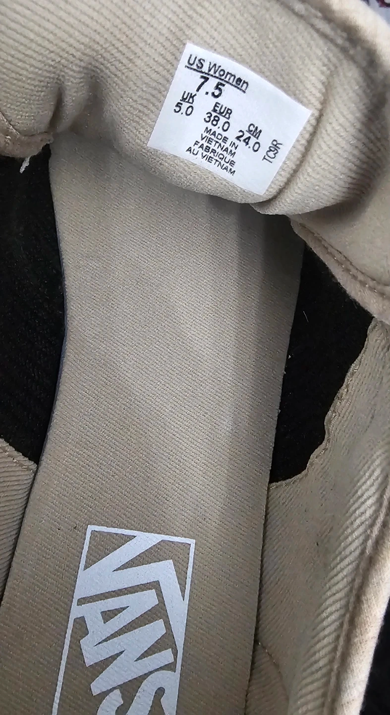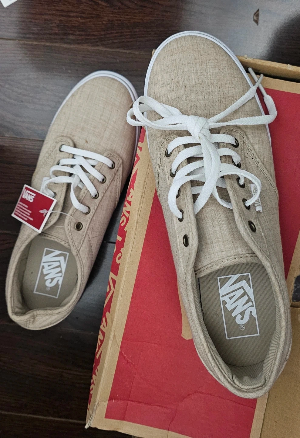 These Vans sneakers are a stylish tan colour with a canvas material. They're a women's US size 7.5. They feature the classic Vans Off The Wall logo. These would be great for everyday casual wear!