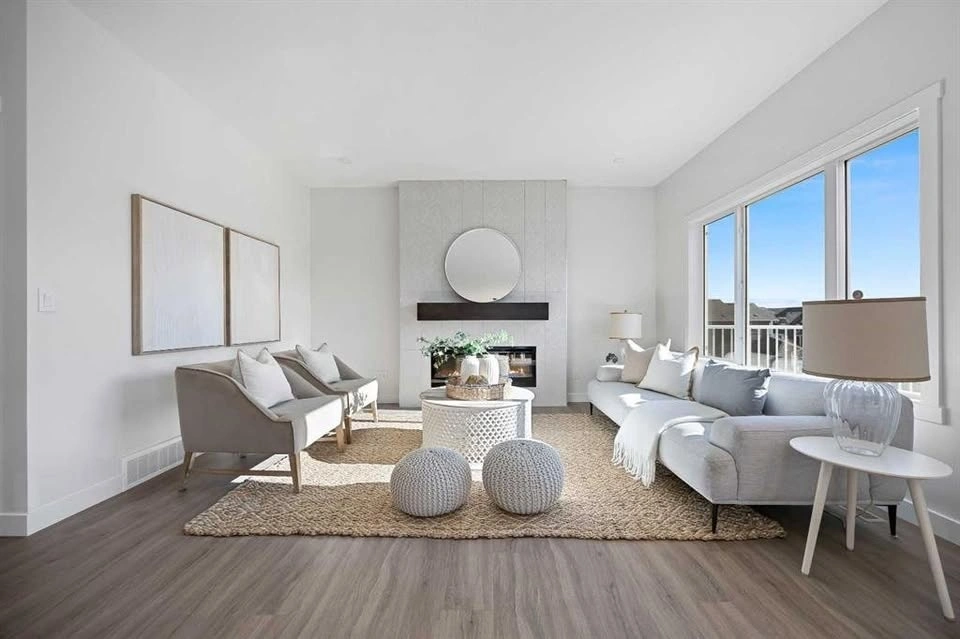 Brand new front garage home in Bayview, Airdrie. 1,936 sq ft with 3 bedrooms and 2.5 bathrooms. Features a south-facing backyard, full-width deck, and walkout basement, perfect for entertaining or future development. The main floor has 9' ceilings, a modern kitchen with quartz countertops and stainless steel appliances, a fireplace, and a double attached garage. Upstairs, you'll find a bonus room, a spacious primary suite with a walk-in closet and ensuite, two additional bedrooms, a full bathroom, and upper-floor laundry. The walkout basement also has 9' ceilings. Bayview offers parks, pathways, and sports facilities for an active lifestyle year-round. Message me to book your private showing.