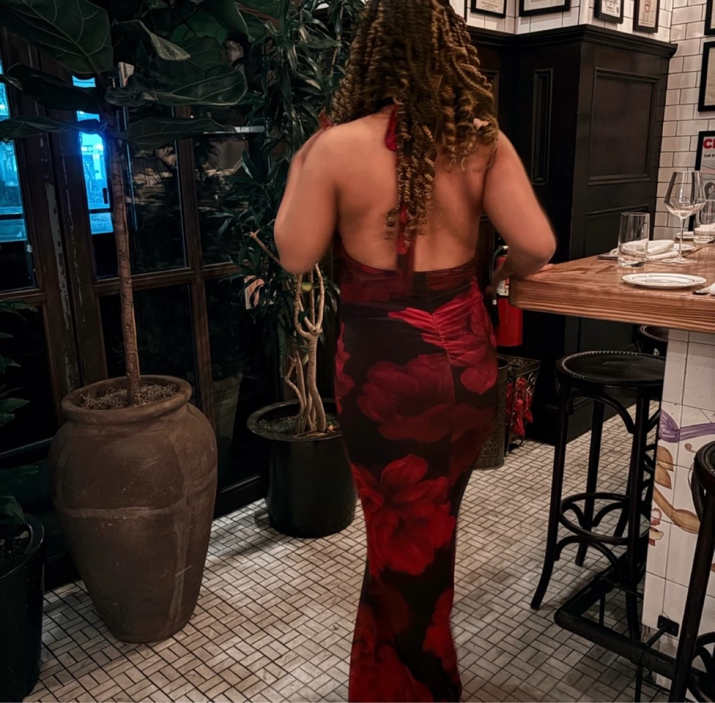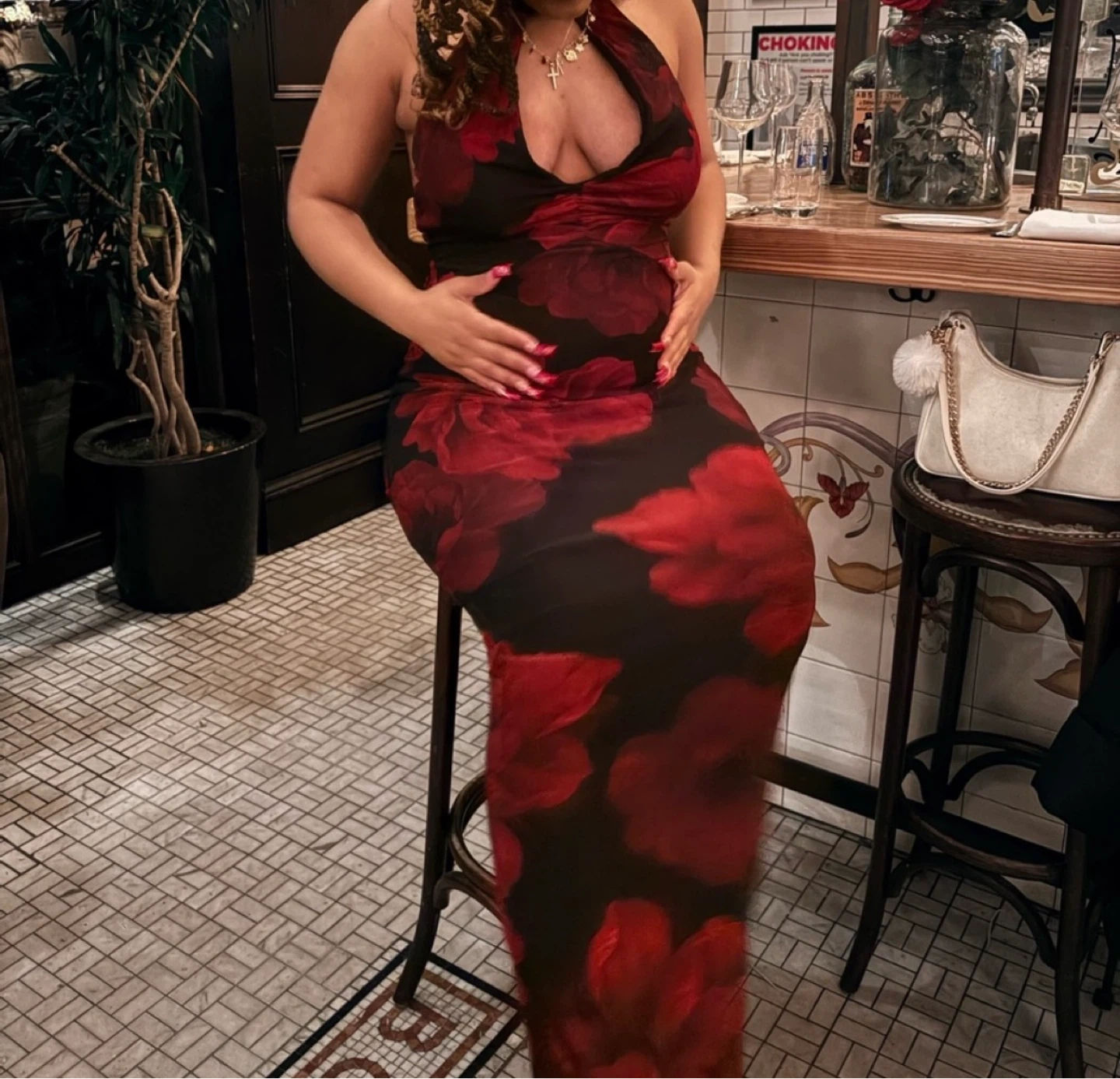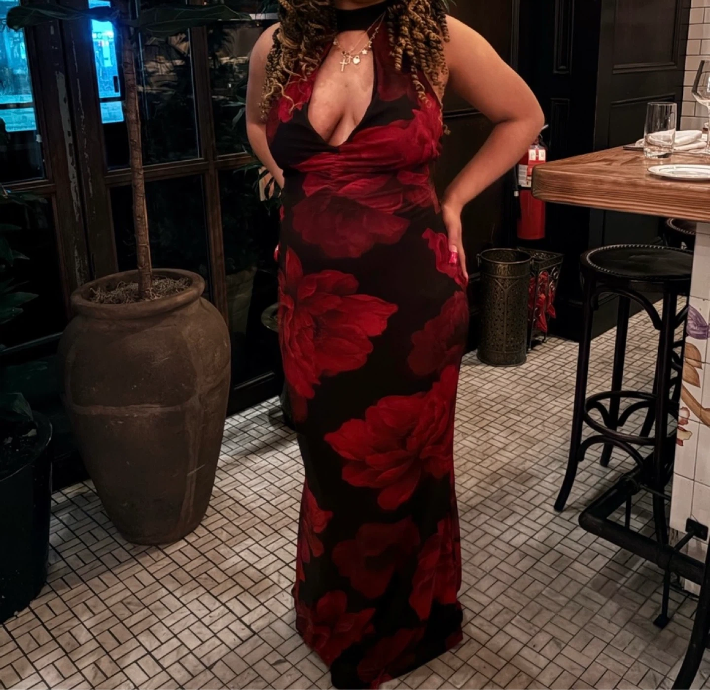 Flowy maxi dress with a striking red floral print on black fabric. It features a halter neckline and a flattering maxi length. Sheer material overlay.