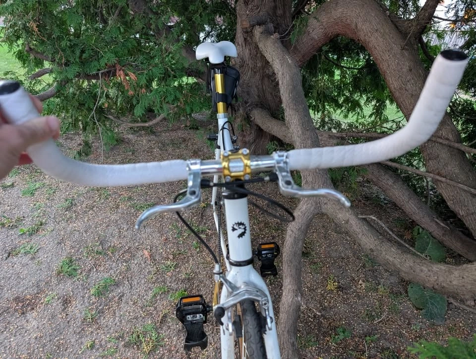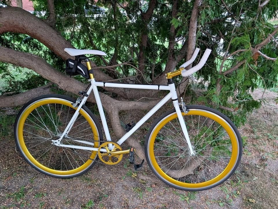 This is your new soulmate. She/He/They are the sexiest bike you've ever met. Easy on the eyes and easy on the legs with its beautiful white and gold paint job, with a single speed gear setup (can easily be made into a fixie if desired). It has a 54 cm frame. It also has a Lightweight chromoly steel frameset, which is lighter than steel and stronger than aluminum. The frame is double butted 4130 Chromoly alloy with a durable powder coat finish. The gear ratio is 46-16t, ideal for light hills and cruising on the cycling path, delivered with a 46t alloy crankset on a 16t rear cog. It features a Flip Flop rear hub, so you can choose between coaster or fixed gear. Dual Pivot brakes, front and rear, provide maximum stopping power. Don't pass this up!